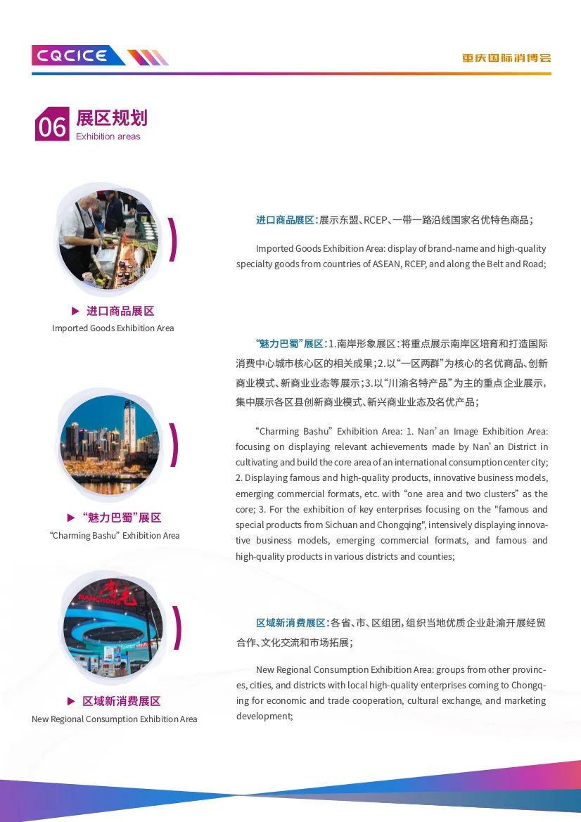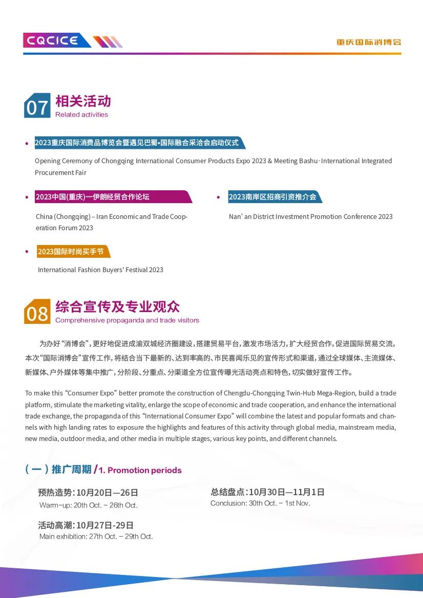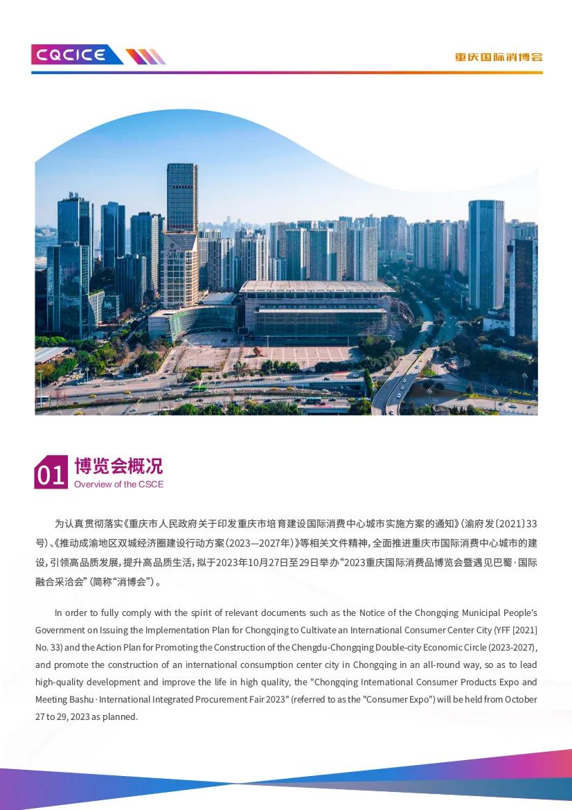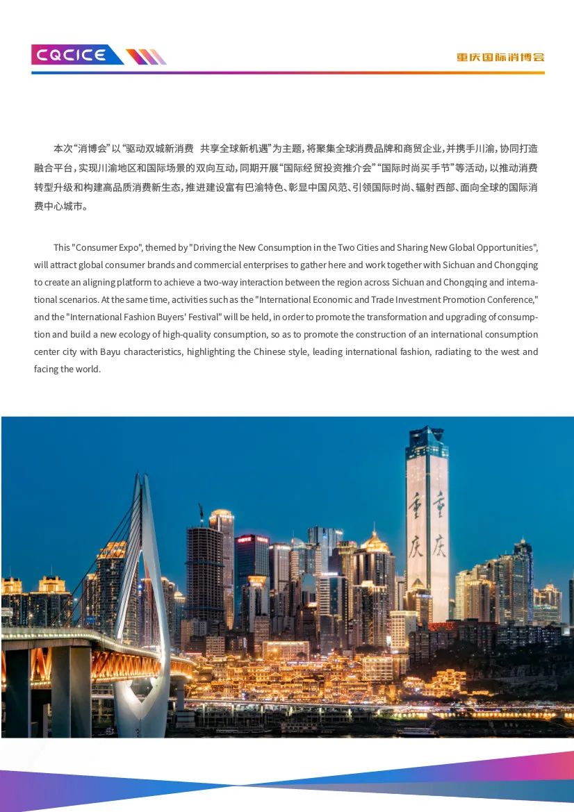 由重庆市商务委员会、南岸区人民政府、中国国际贸易促进委员会重庆市委员会、中国国际贸易促进委员会四川省委员会指导,南岸区商务委员会、中国国际商会重庆商会、中国国际商会四川商会主办的2023重庆国际消费品博览会暨遇见巴蜀·国际融合采洽会(以下简称“消博会”),定于2023年10月27日-29日在重庆国际会议展览中心举办。本次“消博会”以“驱动双城新消费共享全球新机遇”为主题,将聚集全球消费品牌和商贸企业,并携手川渝,协同打造融合平台,实现川渝地区和国际场景的双向互动,同期开展“国际经贸投资推介会”“国际时尚买手节”等活动,以推动消费转型升级和构建高品质消费新生态,推进建设富有巴渝特色、彰显中国风范、引领国际时尚、辐射西部、面向全球的国际消费中心城市。此次博览会展区面积3万平米,设进口商品展区、“魅力巴蜀”展区、区域新消费展区、时尚生活展区、高端食品及酒水饮料展区、消费电子展区、未来汽车展区等多个展区。在此,诚挚地邀请各企业参展、观展采购,深化商贸领域的交流与合作,进一步拓展产品销售渠道。张 坡 3697622 xxsmch2020@163.com张五海 3669026 xxsmchqyb@163.com2023年9月19日