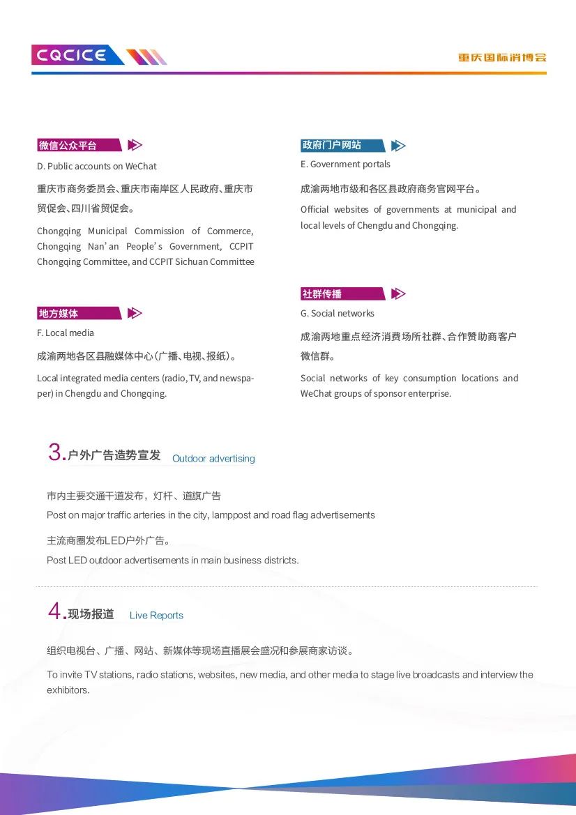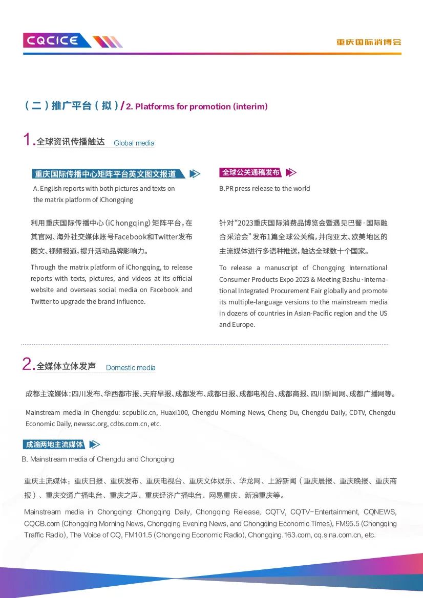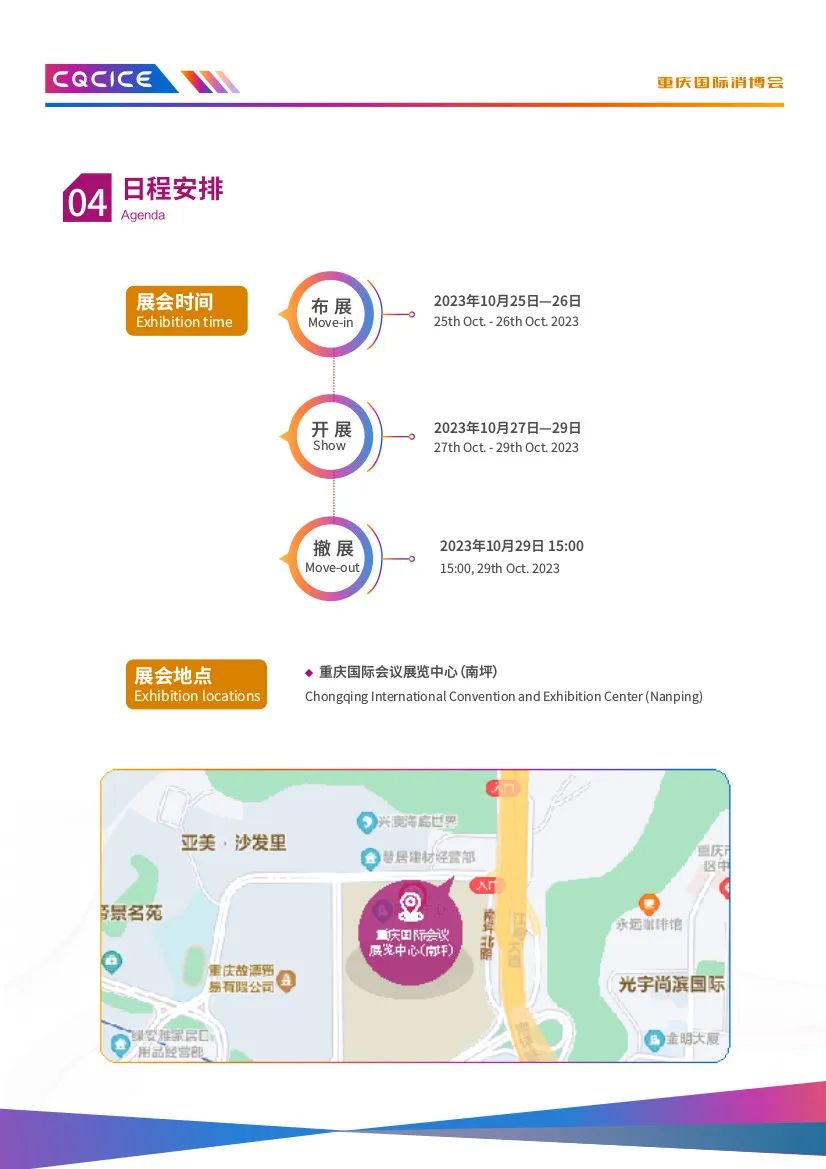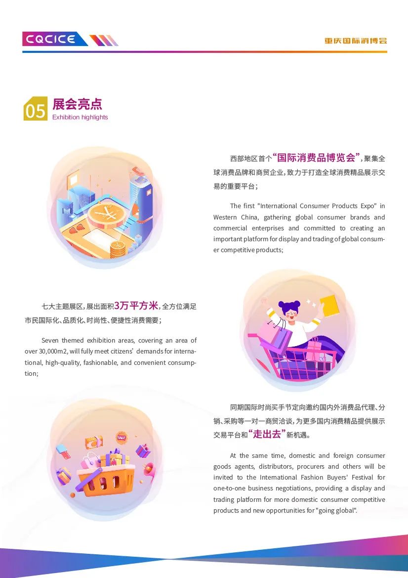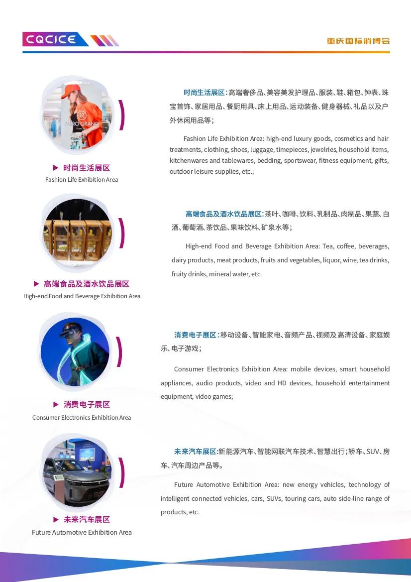 由重庆市商务委员会、南岸区人民政府、中国国际贸易促进委员会重庆市委员会、中国国际贸易促进委员会四川省委员会指导,南岸区商务委员会、中国国际商会重庆商会、中国国际商会四川商会主办的2023重庆国际消费品博览会暨遇见巴蜀·国际融合采洽会(以下简称“消博会”),定于2023年10月27日-29日在重庆国际会议展览中心举办。本次“消博会”以“驱动双城新消费共享全球新机遇”为主题,将聚集全球消费品牌和商贸企业,并携手川渝,协同打造融合平台,实现川渝地区和国际场景的双向互动,同期开展“国际经贸投资推介会”“国际时尚买手节”等活动,以推动消费转型升级和构建高品质消费新生态,推进建设富有巴渝特色、彰显中国风范、引领国际时尚、辐射西部、面向全球的国际消费中心城市。此次博览会展区面积3万平米,设进口商品展区、“魅力巴蜀”展区、区域新消费展区、时尚生活展区、高端食品及酒水饮料展区、消费电子展区、未来汽车展区等多个展区。在此,诚挚地邀请各企业参展、观展采购,深化商贸领域的交流与合作,进一步拓展产品销售渠道。张 坡 3697622 xxsmch2020@163.com张五海 3669026 xxsmchqyb@163.com2023年9月19日