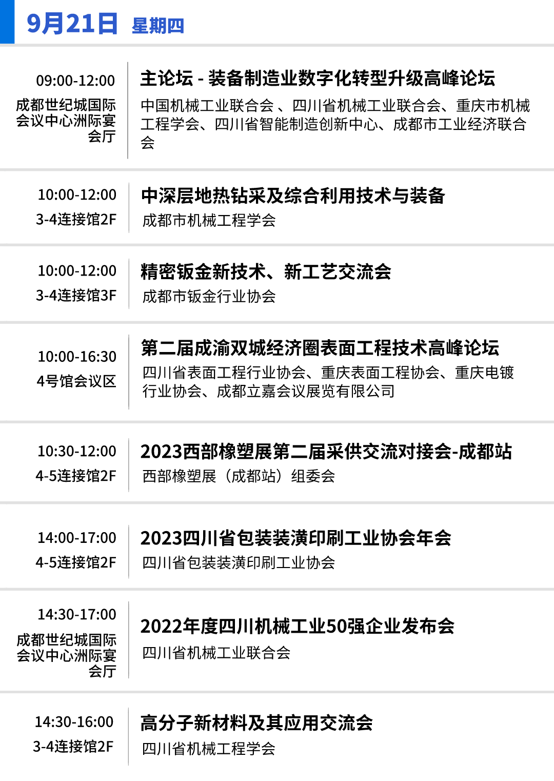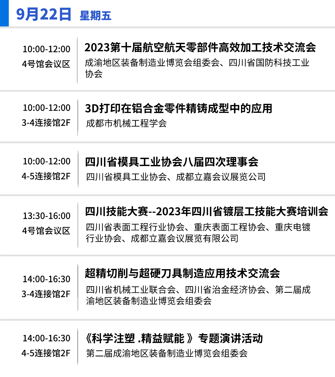 展会同期20余场同期会议活动精彩纷呈,聚焦西南地区市场需求热点,主题涵盖智能制造、航空航天、新能源汽车、数字化、表面工程、轨道交通、包装印刷、热处理、模具制造、铝深加工等领域,先锋观点目不暇接,全新参会导览大全赶紧收藏关注,观展参会不迷路!