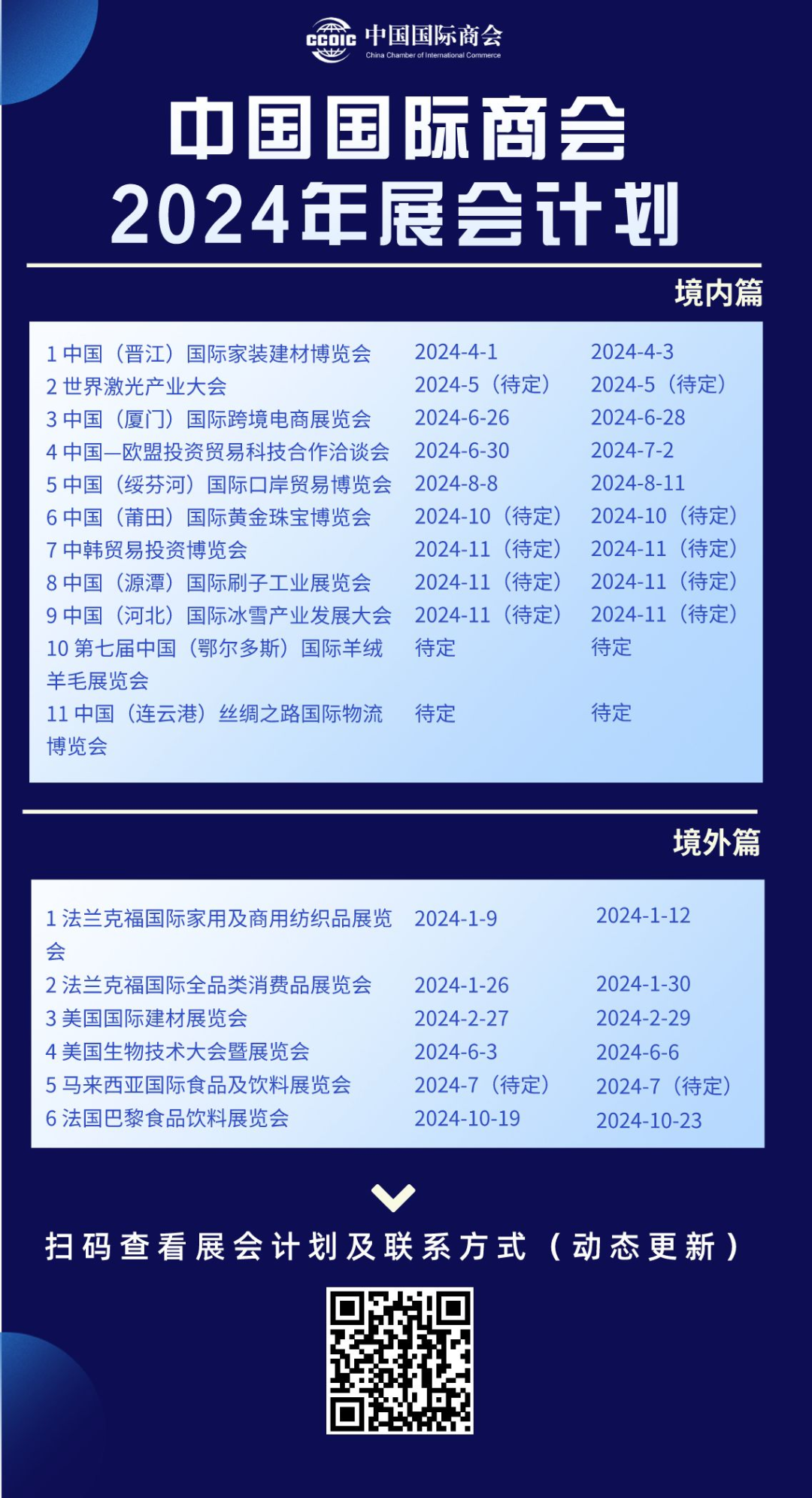 为进一步推动后疫情时期经济复苏,搭建高质量贸易促进平台,协助企业开展对外经贸合作,中国国际商会会展部发布了2024年境内外展会计划。当前发布的为首批计划,以后会不定期更新。欢迎关注并垂询合作事宜。