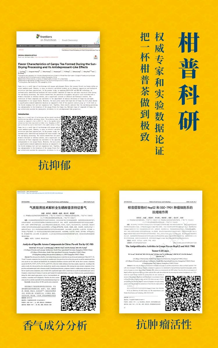 云鼎联合华南农业大学茶学系博士生导师黄亚辉教授、美国麻省大学博士生导师肖航教授完成了业内首例全生晒陈皮柑普茶系统成分分析,其中抗抑郁分析报告已在国际知名科学平台《营养学前沿》(影响因子6.576)发表,抗肿瘤活性分析报告和香气成分分析报告已在国内权威期刊《现代食品科技》发表。