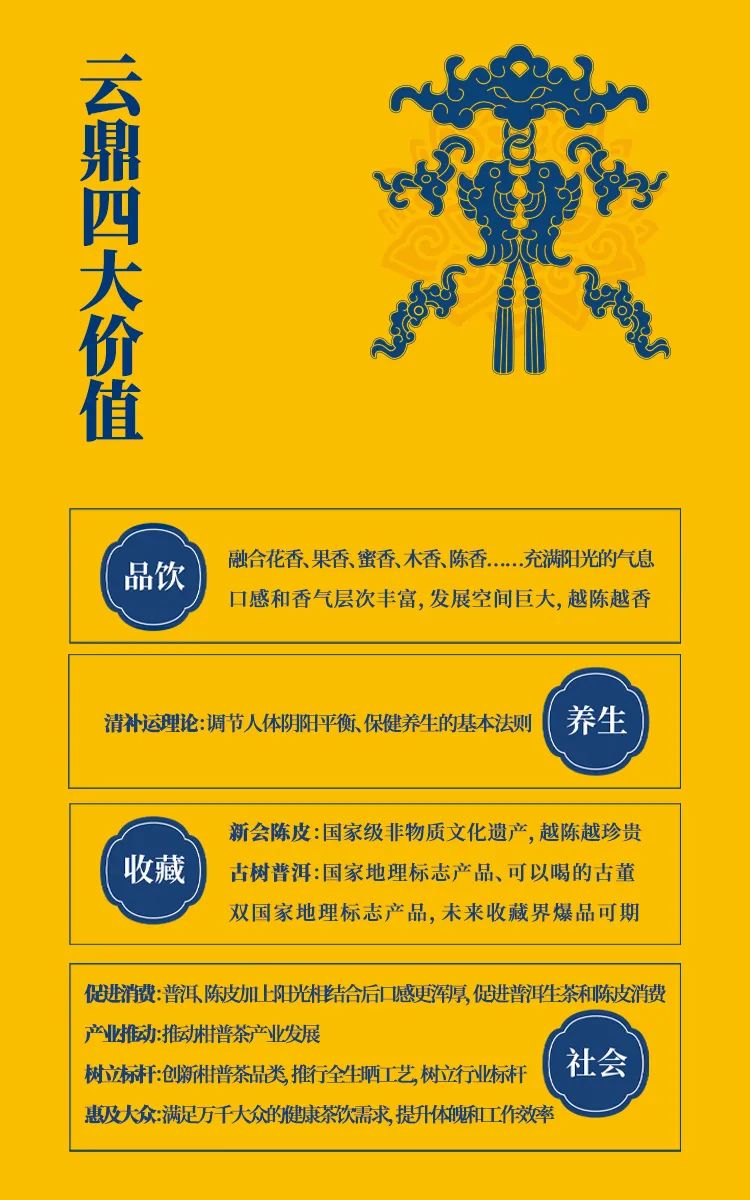 云鼎创建了柑普茶品饮、养生、收藏和社会四大价值体系理论框架,重塑了柑普茶全生晒标准,并构建柑普茶“清补运”大健康养生理论体系,全新定义了柑普茶的匠心之作。