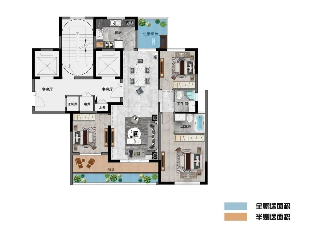 本次120㎡户型分布在高层板块A5栋1单元2单元和A1栋,单层两单元四户配备四部电梯,实现一梯一户的私享电梯厅豪宅待遇。