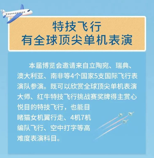 本届博览会邀请来自立陶宛、瑞典、澳大利亚、南非等4个国家5支国际飞行表演队参演。既可以欣赏全球顶尖单机表演大师、红牛特技飞行挑战赛奖牌得主赏心悦目的特技飞行,也能目睹猫女机翼行走、4机7机编队飞行、空中打字等高难度表演科目。