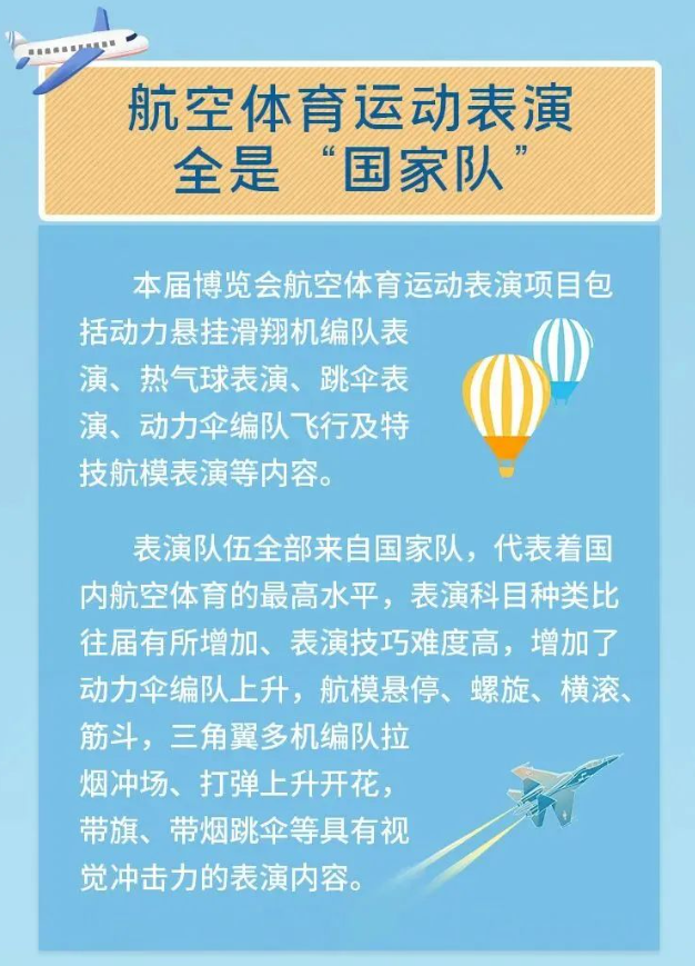 表演队伍全部来自国家队,代表着国内航空体育的最高水平,表演科目种类比往届有所增加、表演技巧难度高,增加了动力伞编队上升,航模悬停、螺旋、横滚、筋斗,三角翼多机编队拉烟冲场、打弹上升开花,带旗、带烟跳伞等具有视觉冲击力的表演内容。