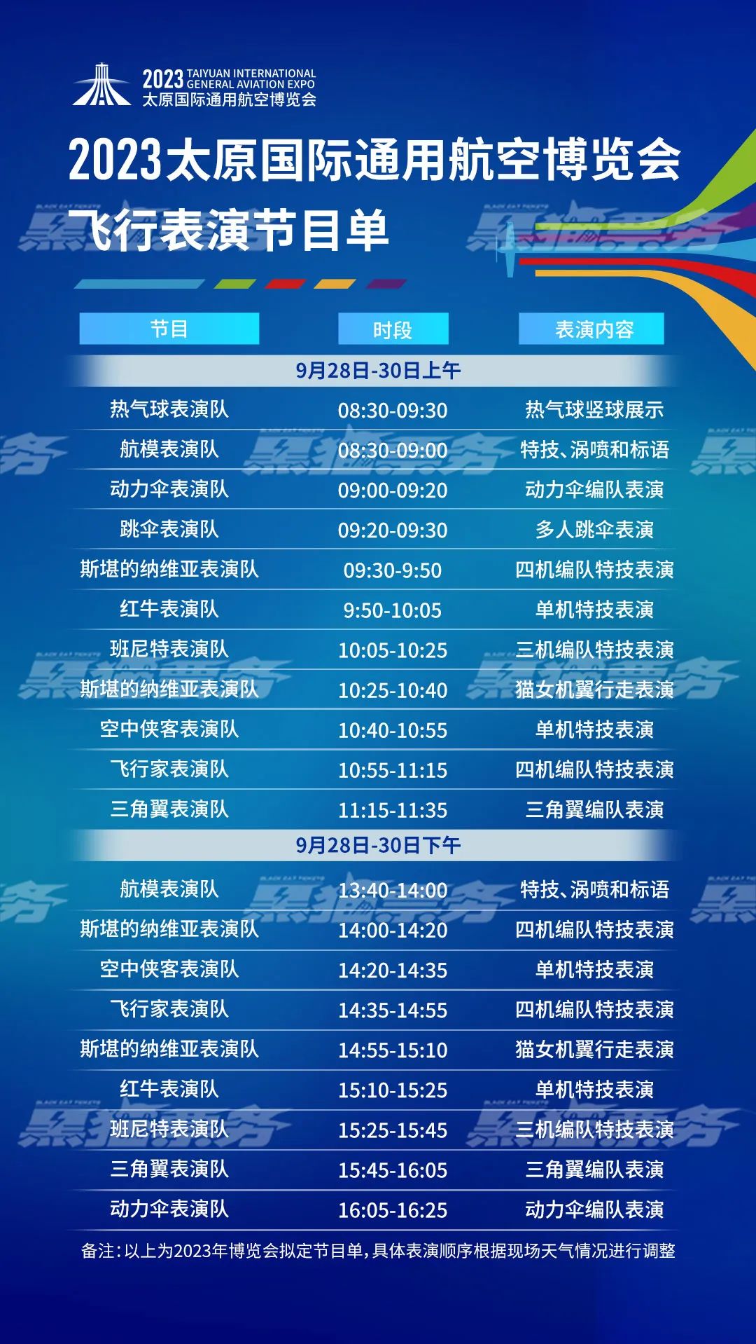 9月28日至30日:在太原尧城机场举行博览会开幕式、飞行表演、静态展示等相关活动。