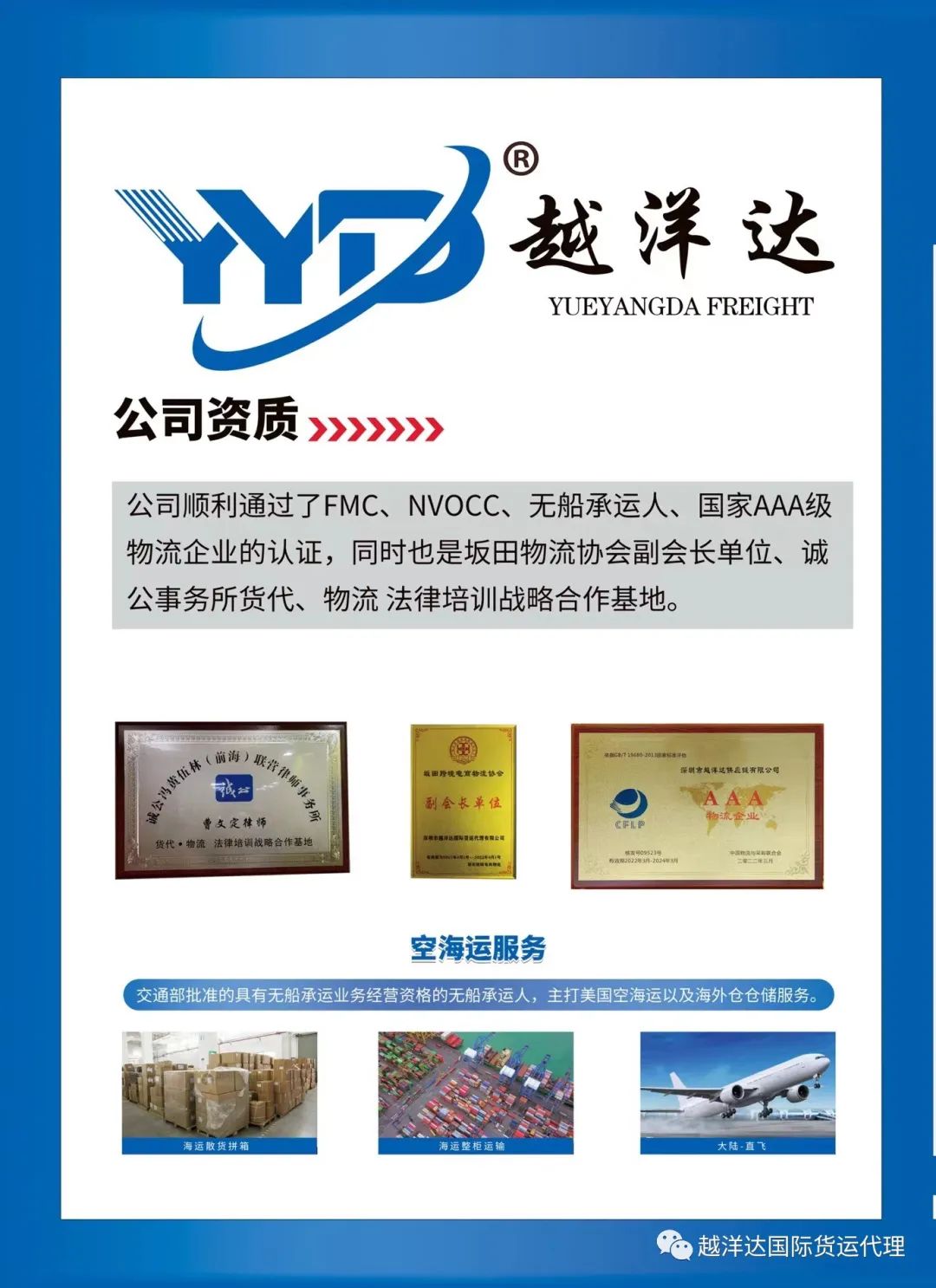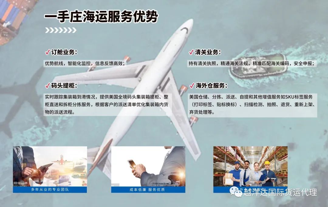 EMC、ZIM、MATSON、CMA、COSCO。越洋达国际致力于为 Amazon,海外仓等跨国电子商务卖家提供国际包裹派送服务,以及工厂和贸易公司国际快递及空运服务提供。公司不断完善系统平台和渠道资源整合,为客户提供专业的优质的一体化物流解决方案,为客户的每个出口包裹提供高效,稳定,安全的物流服务。企业秉承“诚信、专业、团结、创新”的精神,以“为客户提供优质的物流解决方案,让客户真正的省钱省心又放心”为宗旨,服务广大客户。