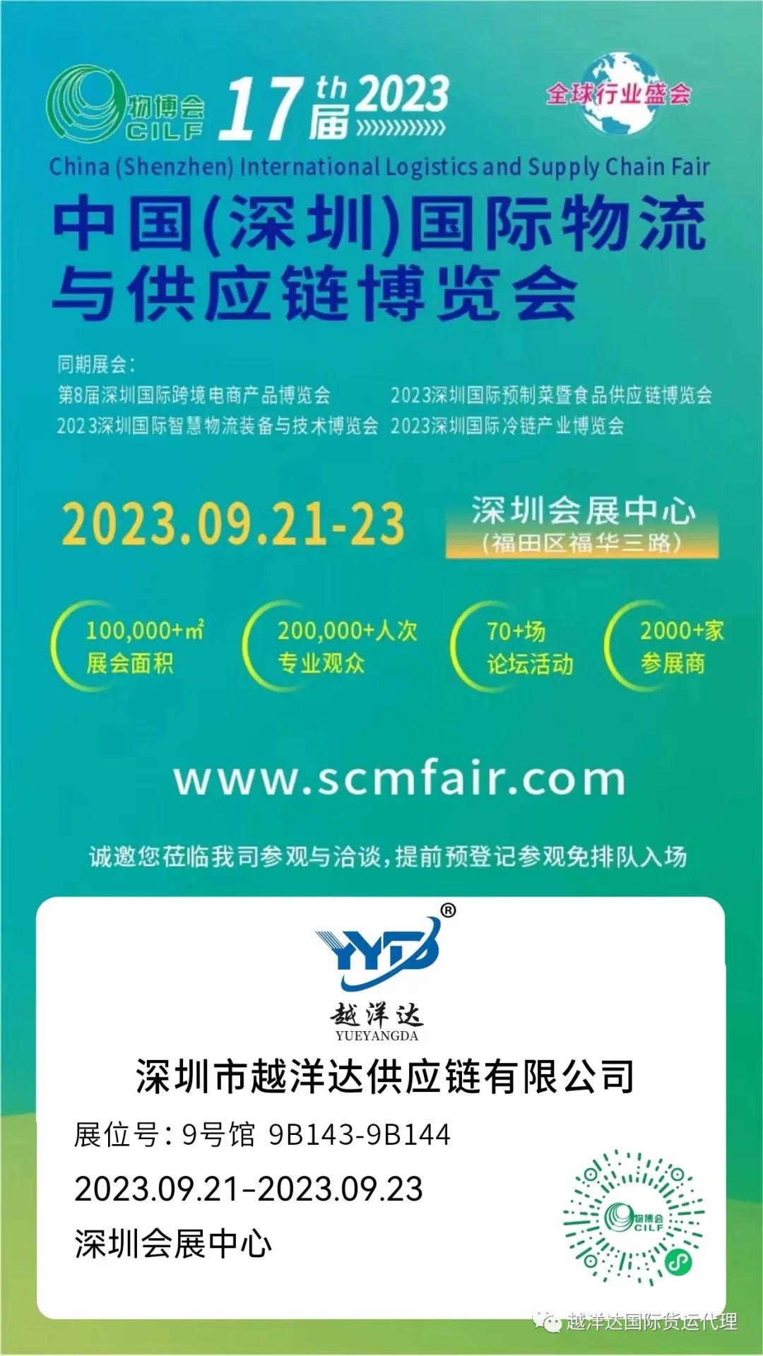 第17届中国(深圳)国际物流与供应链博览会(同期:第8届深圳国际跨境电商产品博览会、2023深圳国际预制菜暨视频供应链博览会、2023深圳国际智慧物流装备与技术博览会、2023中国(深圳)冷链产业博览会)将于2023年9月21-23日在深圳会展中心(福田)举办。本届博览会展会面积10万+㎡,参展企业2000余家,14大参展范围齐头并进,70+场次论坛活动线上线下联合发力,竭力打造2023年度全球物流与供应链行业高质量展会。