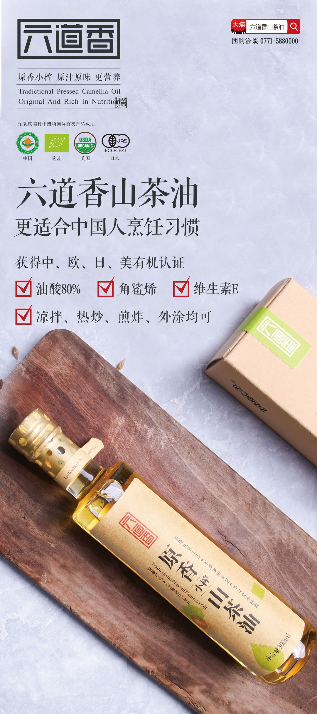 六道香原香小榨山茶油是广西六道香茶油有限公司旗下专业纯茶油品牌。六道香秉承“唯真”品牌理念,传承传统文化精髓,倡导绿色健康生活。公司在传承千年木榨工艺的基础上不断优化升级,首创“六艺小榨”生产工艺,整个生产过程不添加、不勾兑、不采用任何化学工艺,采用纯物理低温压榨工艺生产“原汁原味”的绿色健康茶油。六道香原香小榨茶油,最大限度的保留茶油里的营养物质,是品质安全、营养丰富的健康茶油。