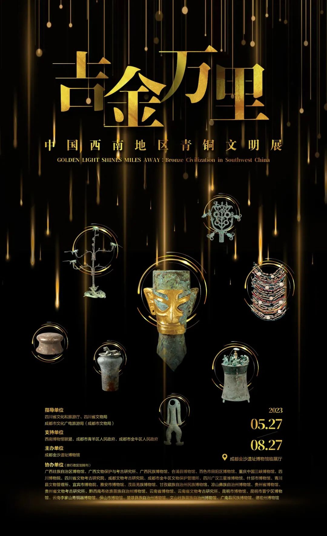 本次展览从中国西南地区的宏观视角出发,选取了各地区的最具代表性的遗址,如川渝地区的三星堆遗址、金沙遗址、涪陵小田溪墓地、城坝遗址、茂县牟托大墓、盐源老龙头墓地等,云南地区的晋宁石寨山墓地、江川李家山墓地、晋宁河泊所遗址、昌宁大甸山遗址、牡宜遗址等,贵州地区的赫章可乐遗址、威宁中水遗址、普安铜鼓山遗址等,广西地区的罗泊湾汉墓、合浦汉墓群等,其中不乏历年中国十大考古发现和近年来的考古新发现,是“考古实证中华民族多元一体”的重要见证。此次展览展出的展品,涵盖铜器、金器、玉器、海贝等多种器类,其中一级文物超过百件,有88件/套文物为首次外展。三星堆铜扭身跪坐人像、小铜立人像,中国境内发现最早的三轮马车实物模型之一,目前四川地区首次发现的铜纺织工具,还有实证西汉政府对云南地区实施有效治理的“益州太守章”“建伶令印”和“滇池长印”封泥,这些考古新发现中出土的珍贵文物,不仅是发掘出土后首次面向公众展出,更证明了中华民族从多元聚为一体、一体容纳多元的发展演变规律,也昭示出中华民族共同体的发展路向与演进格局。