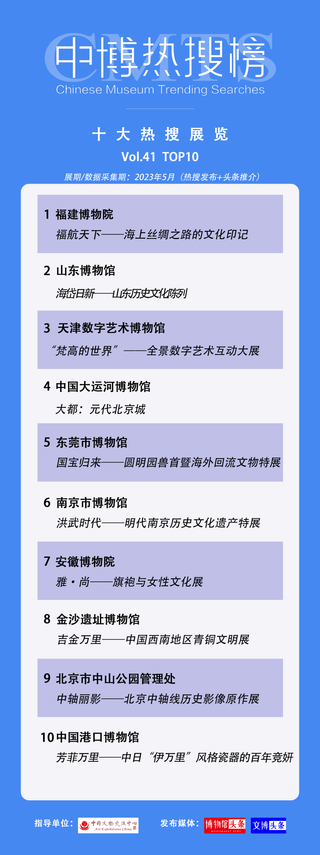中博热搜榜今日发布最新一期(第41期)“博物馆十大热搜展览推介”,本期推介展览为2023年5月受到全国网友高频搜索和较高关注的博物馆十大文博展览。