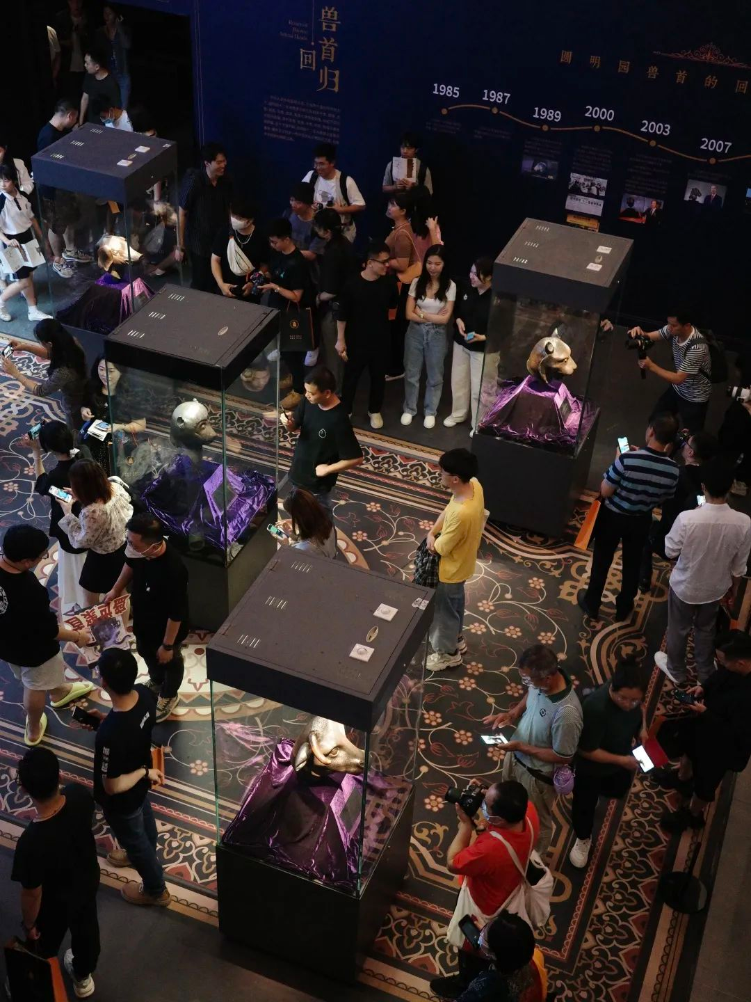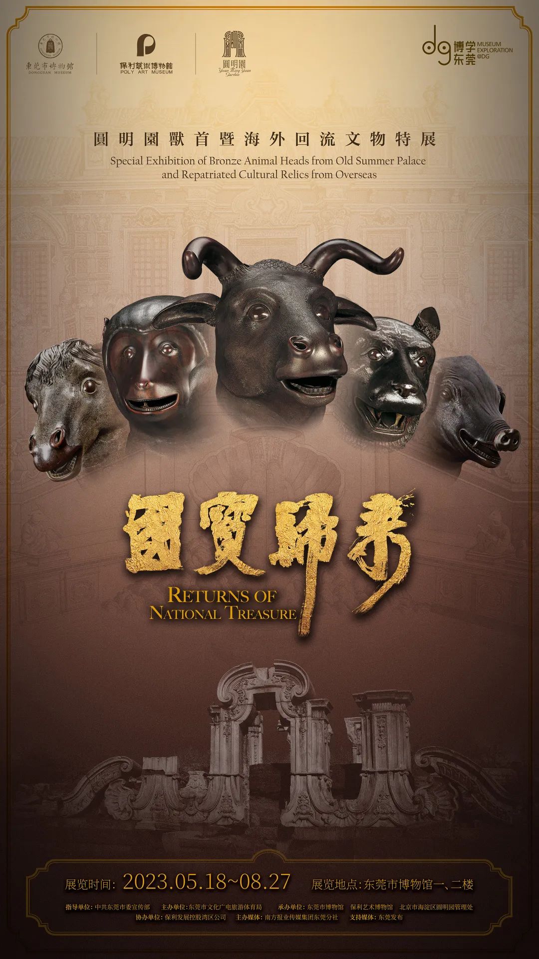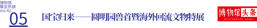 “国宝归来——圆明园兽首暨海外回流文物特展”分“盛世聚首”“青铜时代”“妙相重光”“雪域梵华”四个篇章,展出清代圆明园海晏堂十二生肖兽首之牛首、虎首、猴首、猪首(5月18日至6月18日期间展出为文物原件,6月19日至8月27日期间展出为文物仿制件),马首仿制件以及商周时期青铜重器、南北朝青州佛造像、明清鎏金铜佛等共计86件珍贵文物展品。