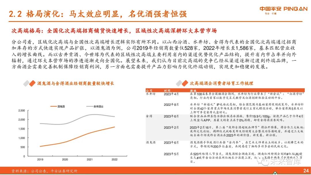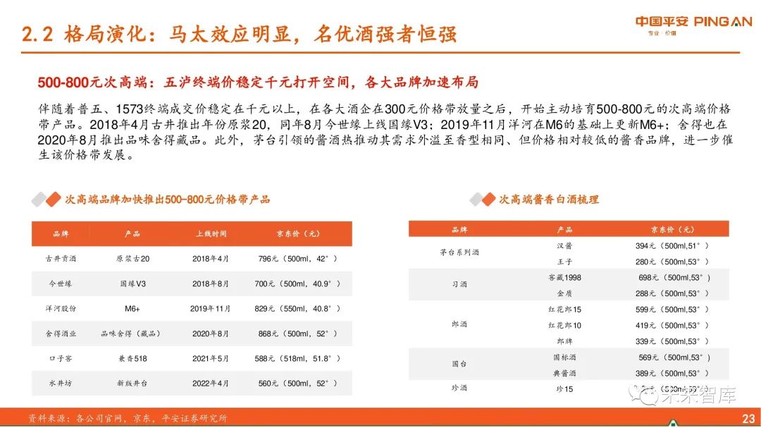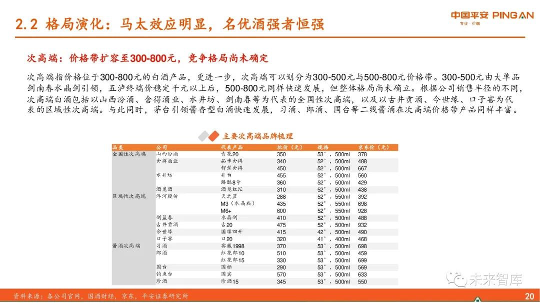 次高端:价格带扩容至300-800元,竞争格局尚未确定。次高端指价格位于300-800元的白酒产品,更进一步,次高端可以划分为300-500元与500-800元价格带。300-500元由大单品 剑南春水晶剑引领,五泸终端价稳定千元以上后,500-800元同样快速发展,但整体格局尚未确立。根据公司销售半径的不同, 次高端白酒包括以山西汾酒、舍得酒业、水井坊、剑南春等为代表的全国性次高端,以及以古井贡酒、今世缘、口子窖为代 表的区域性次高端。与此同时,茅台引领酱香型白酒快速发展,习酒、郎酒、国台等二线酱酒在次高端价格带产品同样丰富。