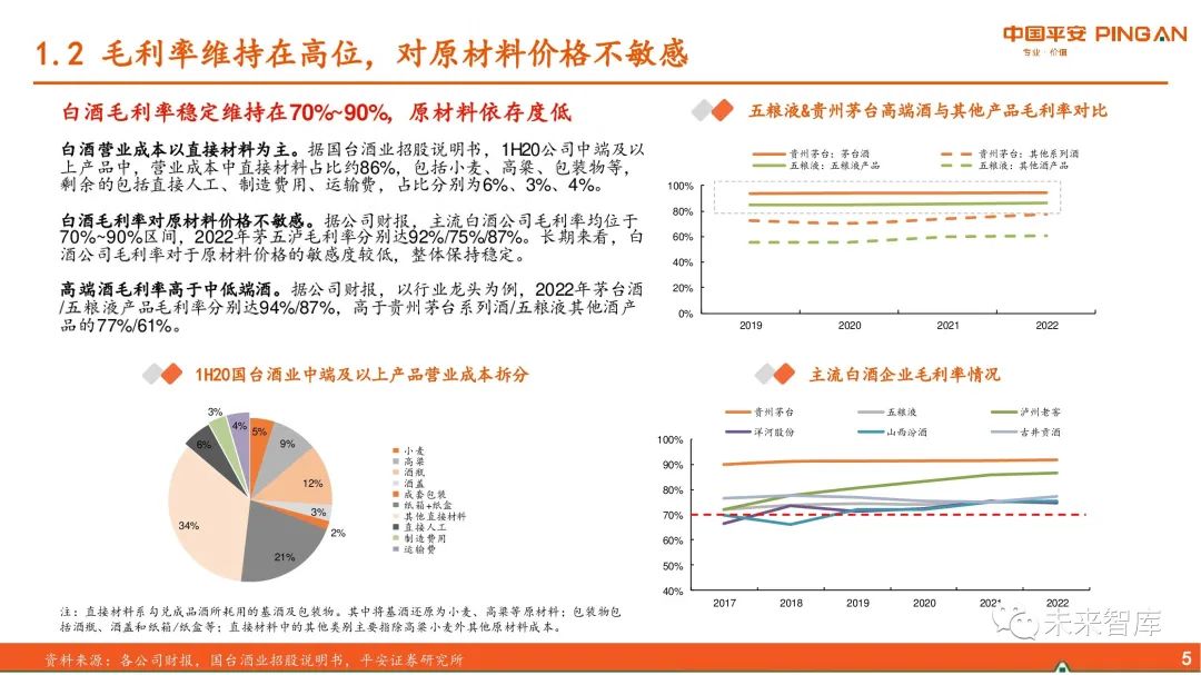 白酒毛利率稳定维持在70%~90%,原材料依存度低。白酒营业成本以直接材料为主。据国台酒业招股说明书,1H20公司中端及以 上产品中,营业成本中直接材料占比约86%,包括小麦、高粱、包装物等, 剩余的包括直接人工、制造费用、运输费,占比分别为6%、3%、4%。白酒毛利率对原材料价格不敏感。据公司财报,主流白酒公司毛利率均位于 70%~90%区间,2022年茅五泸毛利率分别达92%/75%/87%。长期来看,白 酒公司毛利率对于原材料价格的敏感度较低,整体保持稳定。高端酒毛利率高于中低端酒。据公司财报,以行业龙头为例,2022年茅台酒 /五粮液产品毛利率分别达94%/87%,高于贵州茅台系列酒/五粮液其他酒产 品的77%/61%。