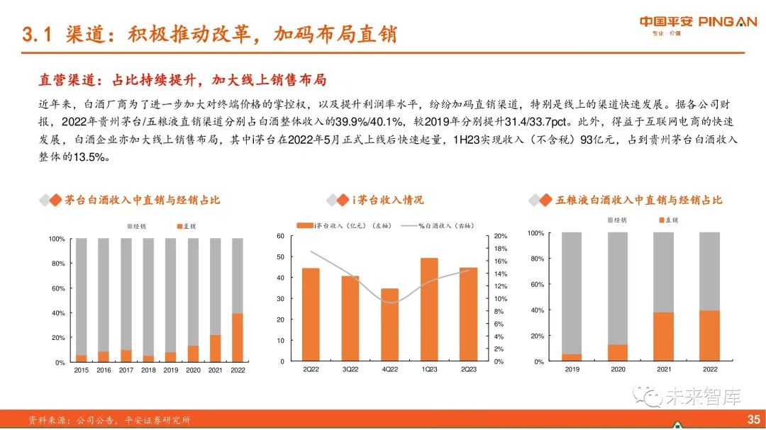 直营渠道:占比持续提升,加大线上销售布局。近年来,白酒厂商为了进一步加大对终端价格的掌控权,以及提升利润率水平,纷纷加码直销渠道,特别是线上的渠道快速发展。据各公司财 报,2022年贵州茅台/五粮液直销渠道分别占白酒整体收入的39.9%/40.1%,较2019年分别提升31.4/33.7pct。此外,得益于互联网电商的快速 发展,白酒企业亦加大线上销售布局,其中i茅台在2022年5月正式上线后快速起量,1H23实现收入(不含税)93亿元,占到贵州茅台白酒收入 整体的13.5%。