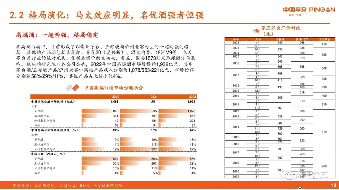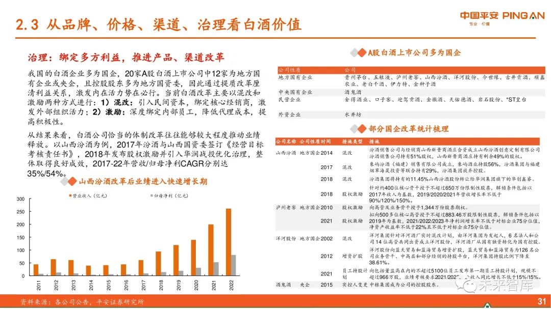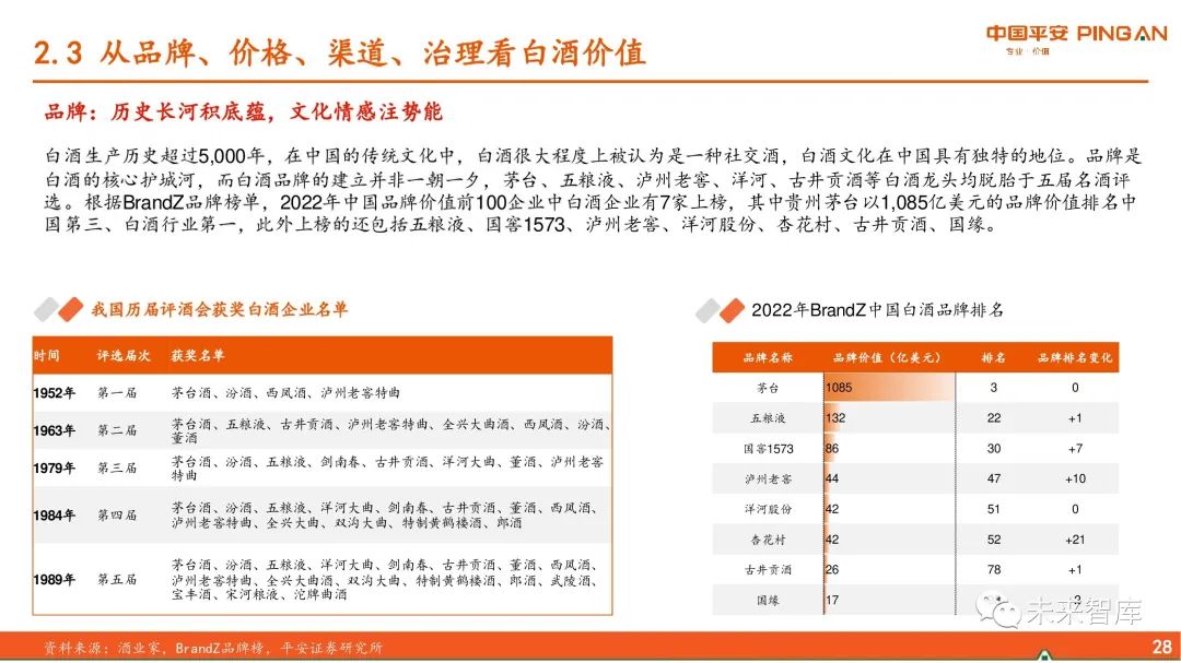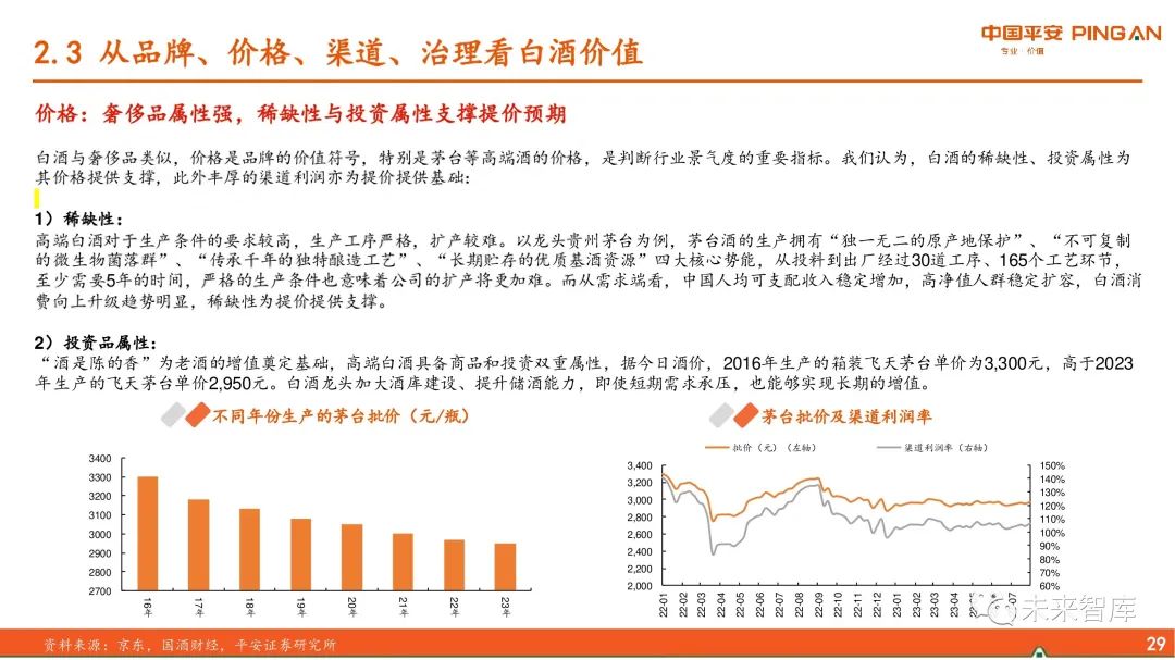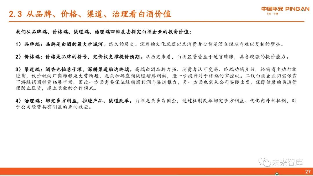 我们从品牌端、价格端、渠道端、治理端四维度去探究白酒企业的投资价值:1)品牌端:品牌是白酒的最大护城河。悠久的历史、深厚的文化底蕴以及消费者心智是酒企短期内难以复制的壁垒。2)价格端:价格是品牌的符号,定价权支撑提价预期。从历史来看,白酒显著受益于通货膨胀,具备较强的提价能力。3)渠道端:酒香也怕巷子深,深耕渠道触达终端。高端白酒品牌力强、消费者认可度高、终端动销良好,经销商主动打款 进货,议价权向厂商转移是大势所趋,龙头加码直销渠道增厚利润,进一步提升对于终端的掌控权。二线白酒企业仍需依靠 下游经销商铺货拓展市场,因此一方面需要保证经销商利润与渠道推力,另一方面也需从公司实际出发,保障健康的渠道管 理防止压货,建立长效的合作模式。4)治理端:绑定多方利益,推进产品、渠道改革。白酒龙头多为国企,通过机制改革绑定多方利益、优化内外部机制,对 于公司经营具有明显的正向效应。