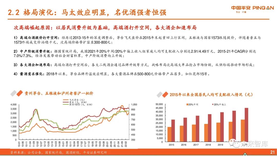 2016以来,人均可支配收入快速增长、高净值人群扩容,居民个人消费接力政军消费,成为白酒需求的新增长极。名优酒企强者恒强,龙头议 价能力提升,产品护城河持续拓宽,行业马太效应明显,白酒价格整体呈上升态势,白酒指数(中信)也随之上行。2018年受中美贸易战、宏 观去杠杆等因素影响,指数整体回撤,但高端与次高端白酒企业收入实际稳健。2019年白酒指数触底回升,2020年疫情下市场整体流动性宽 松,白酒估值持续上行。受疫情多点散发扰动实体经济、房地产增速下滑等因素影响,3Q21以来中国宏观基本面承压、GDP增速下行,白酒指 数与估值均有回落,但估值回撤幅度明显高于指数,中国的白酒企业疫情扰动下基本面仍然保持稳健。此外,厂商对于品牌的重视度持续提升, 竞争逐渐由经销渠道转向终端的消费者,直营渠道占整体销售的比例快速提升。
