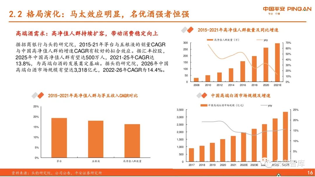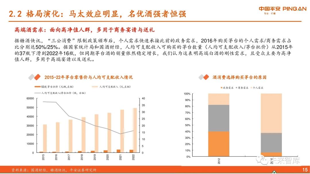 高端酒需求:面向高净值人群,多用于商务宴请与送礼。据糖酒快讯,“三公消费”限制政策颁布后,个人需求快速承接此前的政务需求,2016年购买茅台的个人需求/商务需求占 比分别达50%/25%。据国家统计局和国酒财经,人均可支配收入可购买的茅台数量(人均可支配收入/茅台批价)从2015年 的37瓶下滑到2022年16瓶,但同期茅台酒的销量依然稳定增长,我们认为这表明高端白酒的刚性需求,且受众主要为高净 值人群,多用于高端宴请以及送礼。