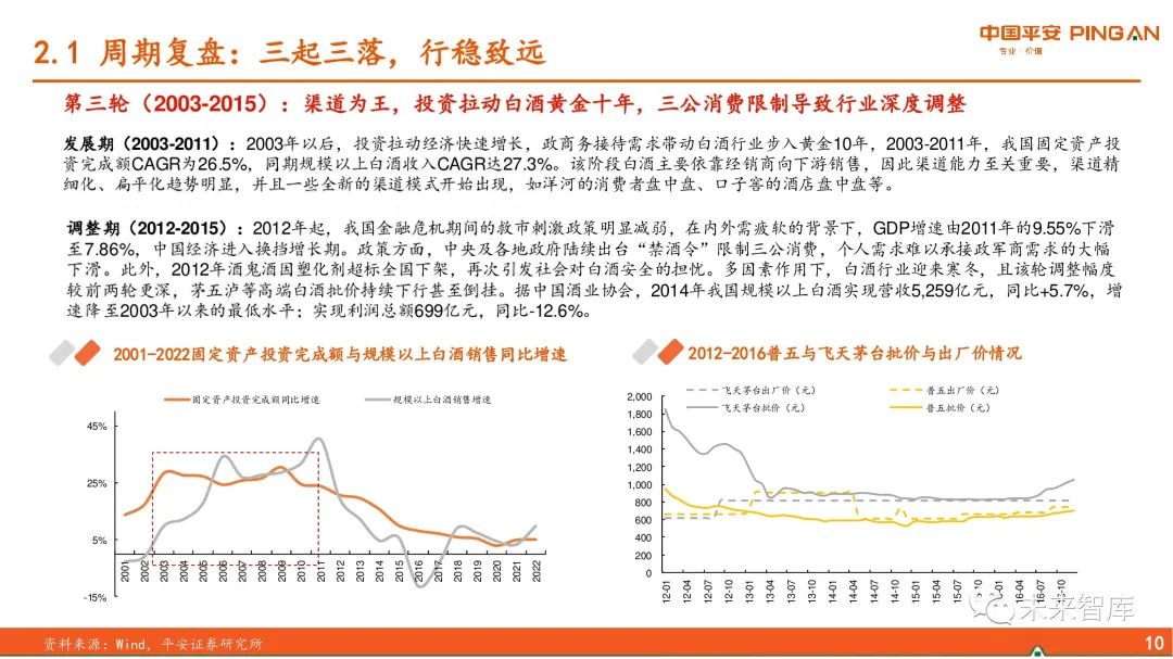 第三轮(2003-2015):渠道为王,投资拉动白酒黄金十年,三公消费限制导致行业深度调整。