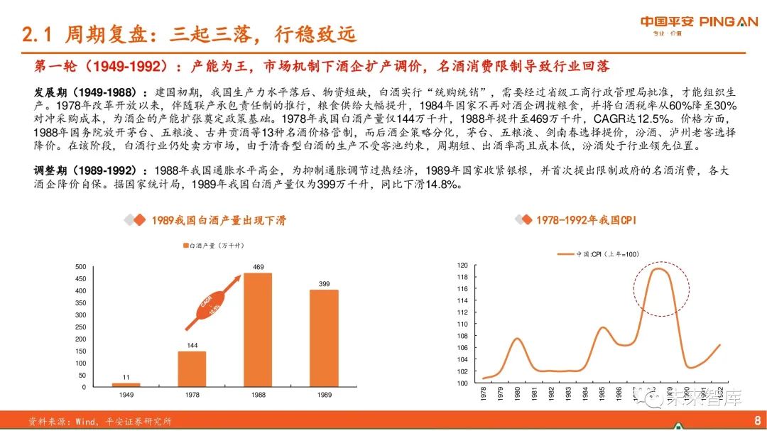 第一轮(1949-1992):产能为王,市场机制下酒企扩产调价,名酒消费限制导致行业回落。