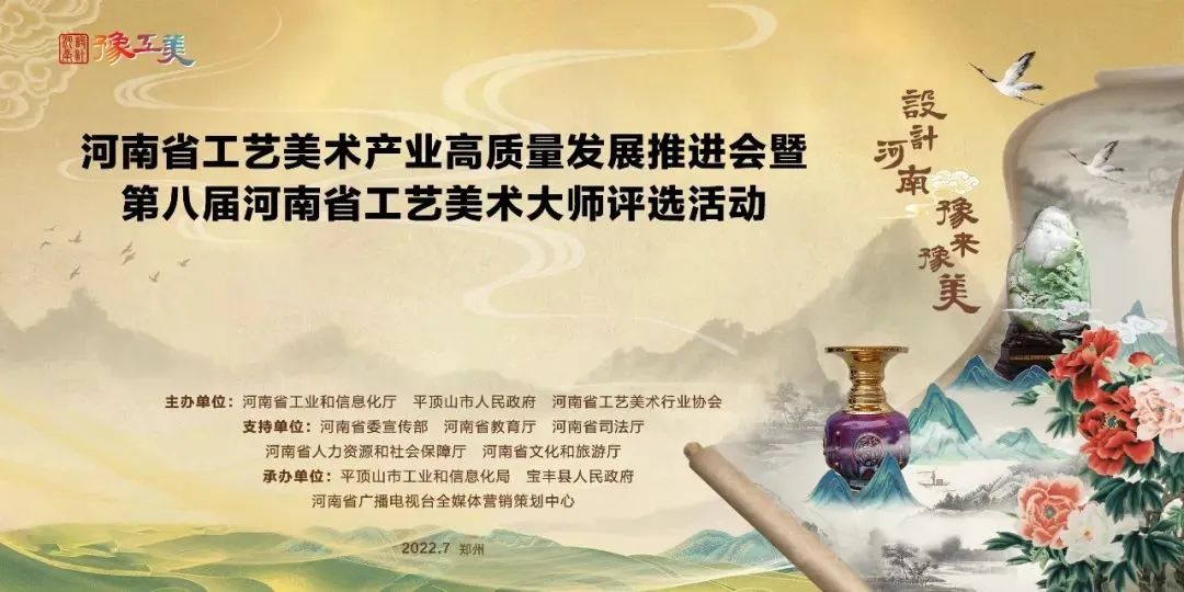2022年,为贯彻落实省委省政府“设计河南”有关决策部署,进一步弘扬优秀传统文化,加强全省工艺美术人才队伍建设,选树工艺美术领军人物,促进传统工艺传承创新,推动工艺美术产业高质量发展,由河南省工业和信息化厅、平顶山市人民政府、河南省工艺美术行业协会共同主办,宝丰县人民政府承办的河南省工艺美术产业高质量发展推进会暨第八届河南省工艺美术大师评选活动将于7月28日在平顶山市宝丰县举行。