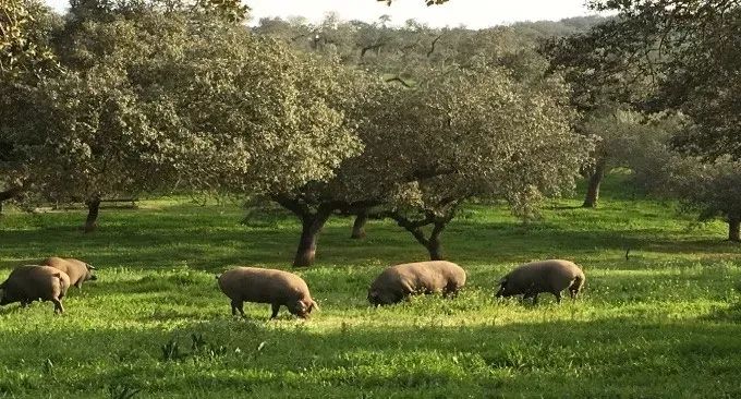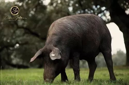 “黑脚猪”(Pata Negra),是地中海猪种和非洲猪经数百年的交配衍生出来的珍贵品种。其吻部细长,背脊和腿部肌肉发达,腿比其他猪更纤细。不过,伊比利亚猪并不都是通体全黑。有的猪皮肤呈现红色,有的猪带有斑点,还有一些猪是浅色,但该品种已经接近灭绝。