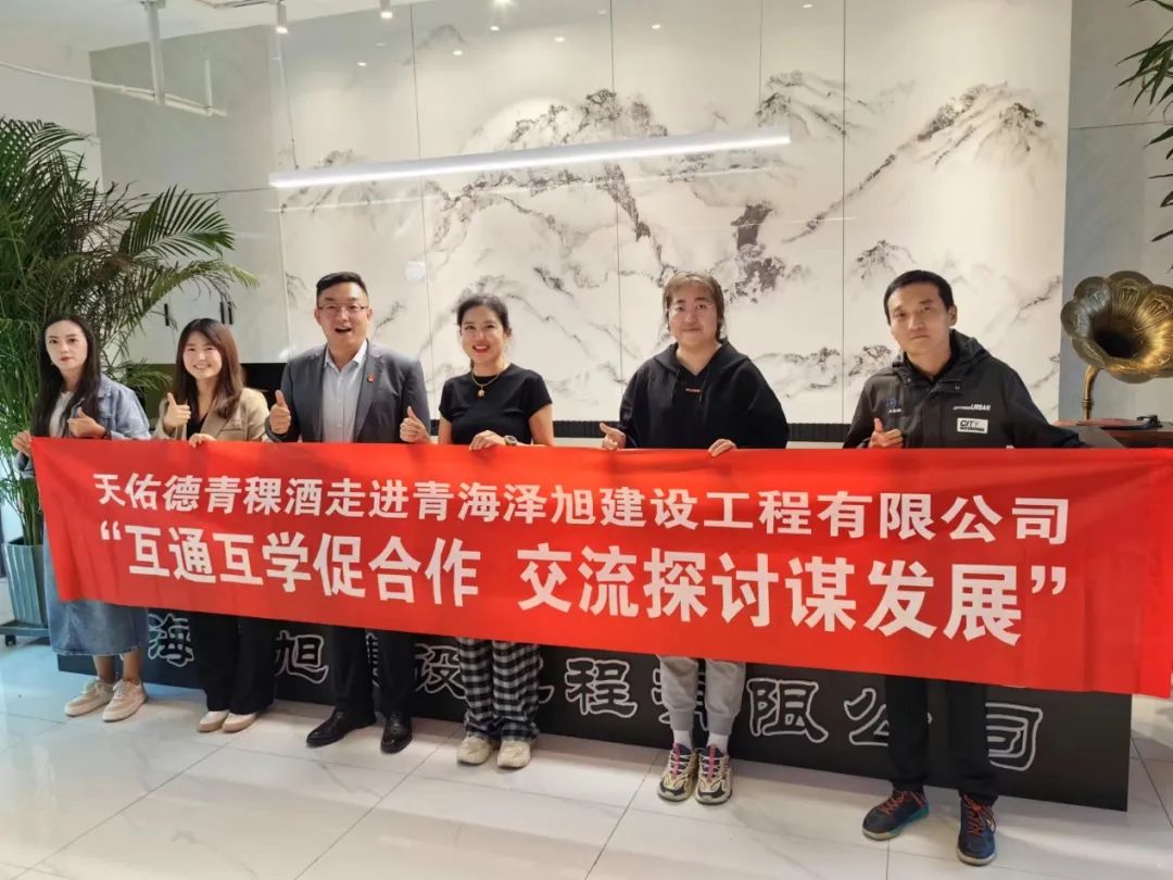 2023年9月19日,天佑德青稞酒走进泽旭建设工程有限公司,开展以“互信互学促合作 交流探讨谋发展”为主题的交流活动。泽旭建设工程有限公司总经理樊书寿、泽旭建设工程有限公司行政总监张馨之、泽旭建设工程有限公司财务总监张芊荟、天佑德青稞酒高端酒业务部部长孙延奎、天佑德青稞酒市场内容策划部部长封江、天佑德青稞酒高端酒业务部团购经理赵仕林、人力资源部讲解员宋晓玲参加了此次活动。