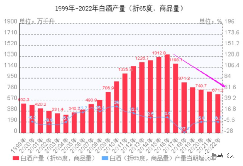 2005年到2016年,是中国经济持续大发展的阶段,是消费升级非常猛烈的阶段,也是白酒持续产销双升的阶段。2016年到达顶峰后,白酒开始产销开始大幅度下降,连续6连降。6年时间,产量降幅高达48.89%。