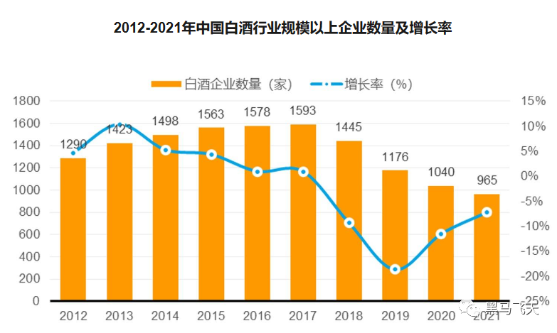 2017年规模以上酒企1593家,到了2021年只剩下965家,628家酒企消失在竞争中,减少幅度高达39.4%。