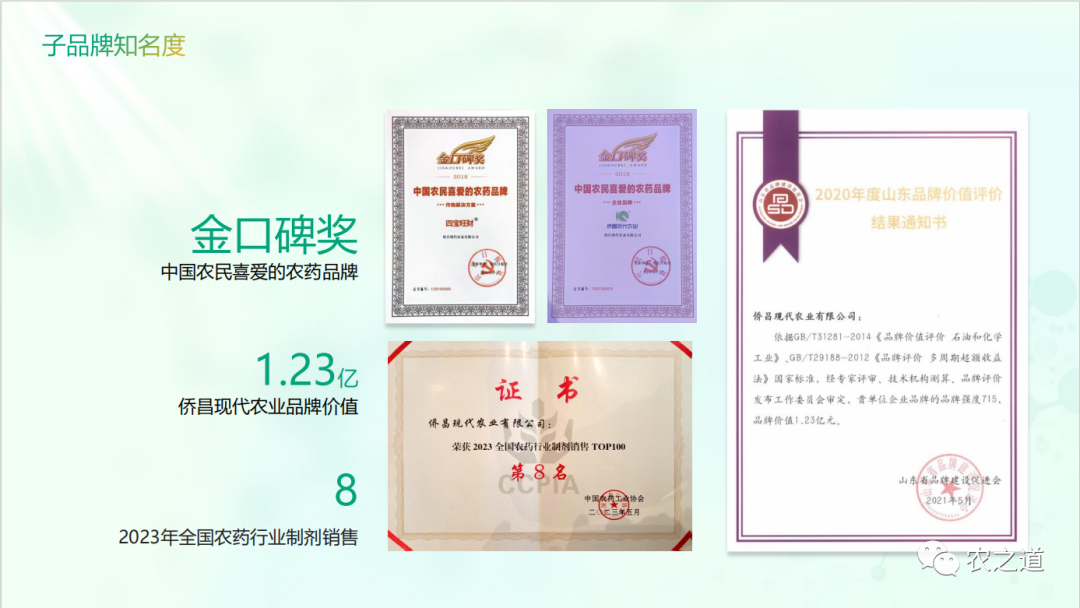 侨昌现代农业以市场为导向,在国内外建立了完善的客户服务网络,终端服务网点3800余个,1000多个品规完成全球80余个国家的登记和GLP实验室的认证。运用DT、LIMS、CRM、ERP、WMS等数字化系统实时数据分析,提供个性化技术指导、供应链、金融等增值服务,构建价值共同体,打造信任协同的供应链商业生态。