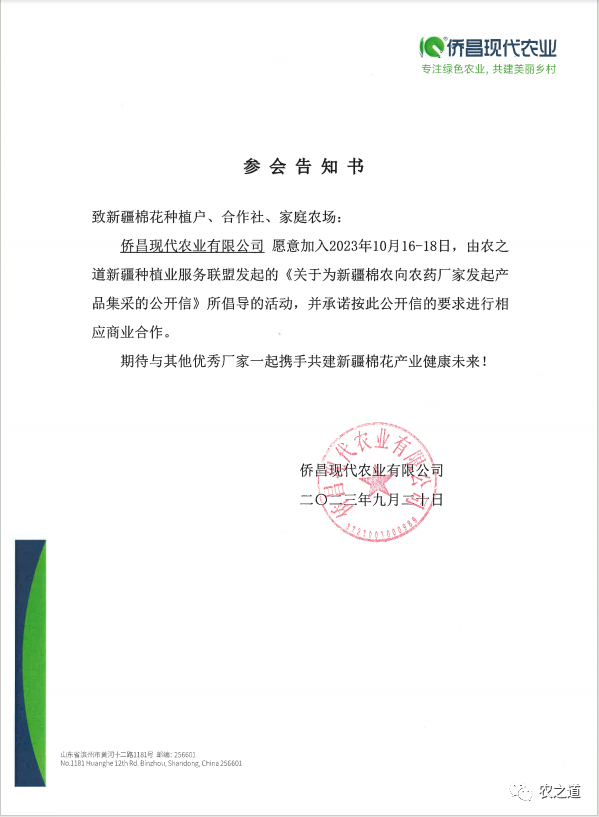 为共同完善新疆棉花全程、系统、兼容解决方案,努力践行企业社会责任,为新疆棉农节本增效,侨昌现代农业有限公司决定加入农之道新疆种植业服务联盟,与全国其它优秀企业一起携手,共建新疆棉花产业健康未来。