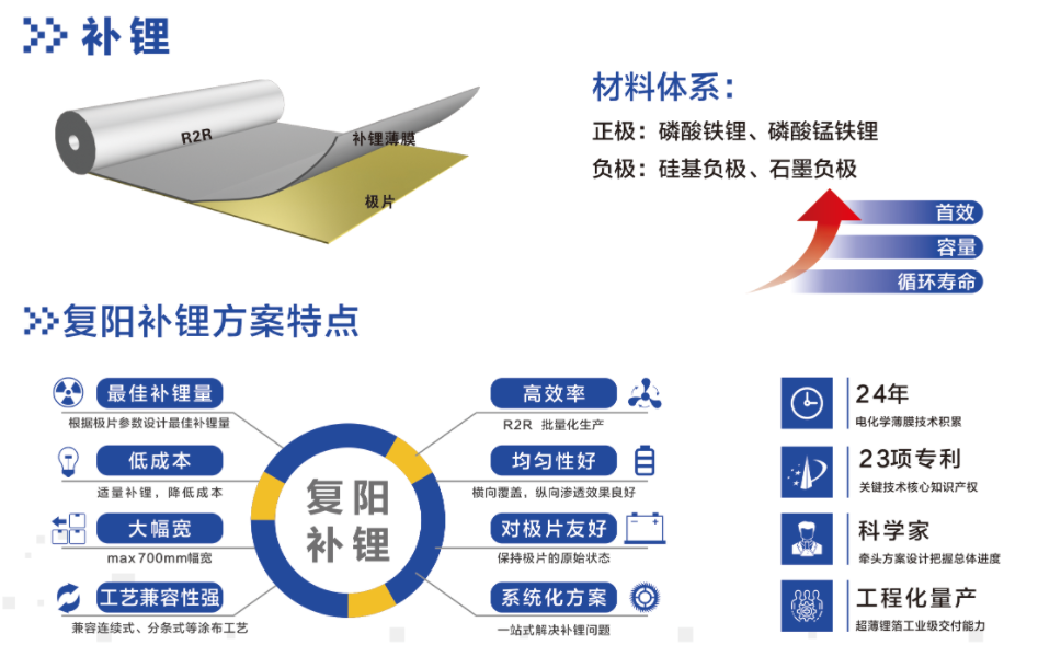 复阳固态在电化学薄膜领域拥有24年的专业经验,能够为客户在提供系统的补锂解决方案。目前已针对硅氧负极、硅碳负极、石墨负极、硬碳负极等材料体系进行补锂,涉及动力电池、消费电池、电容器等领域。