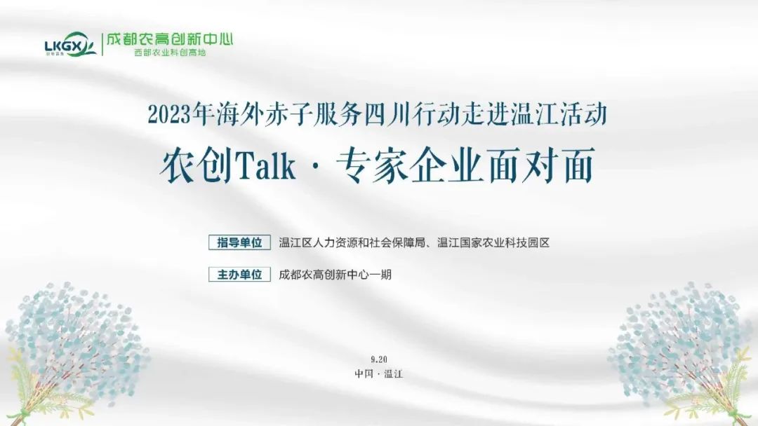 9月20日,温江国家农业科技园区联合区人社局、四川隆康高新农业发展有限公司,特邀胡延春、甘炳成、郑志勤专家组,带着最新的科技成果和经验,在成都农高创新中心一期开展“农创Talk下午茶——专家企业面对面”活动,为园区招引企业提供技术支持和解决方案。