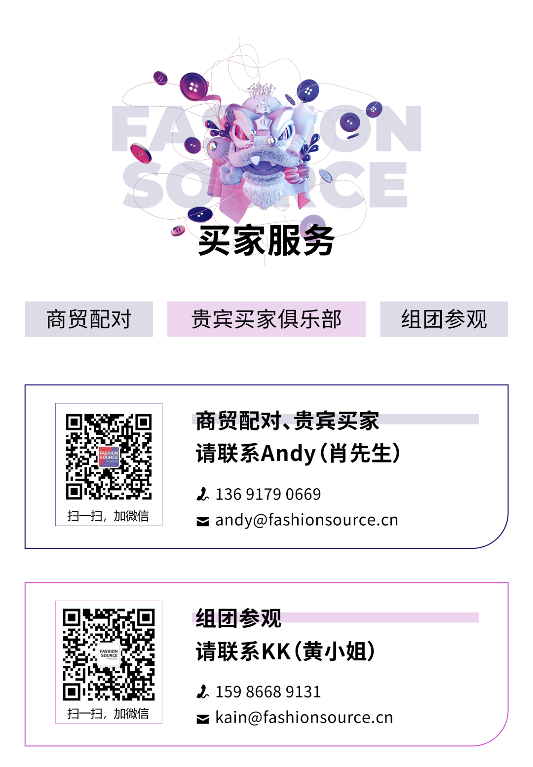 除此之外,以结合流行趋势主题、创意空间设计、艺术灵感陈列与时尚科技应用于一体的沉浸式面辅料选品空间——“有料”流行趋势主题选品区;通过直播、圆桌洽谈以及现场选品会的形式来挖掘女装生意新潜力;探讨秋冬女装生意新增长的抖音电商综合业务女装行业商达撮合会;多维度带你玩转视觉营销的陈列共和X FS会场;集结设计新生代的设计新势力院校专区等专区的加入也为展会注入全新活力!