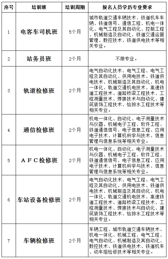 沈阳地铁集团有限公司(以下简称“地铁集团”)是承担沈阳市城市快速轨道交通建设、运营、多种经营的大型国有独资公司。目前,地铁集团已运营线路4条,分别为1、2、9、10号线,总长117公里,共设车站92座(含换乘站7座)、车辆段/停车场5座,控制中心2座。在建线路5条,分别为3、4、6号线、1号线东延线和2号线南延线,总长140公里,共设车站99座。全部建成后总里程将达到257公里。在既有线路平稳运营、新线陆续兴建的今天,我们诚邀您的加入,共同开创未来事业。现面向社会开设“2023年轨道交通行业技能培训班”并开展招生工作。本次招生七个班次,分别为:电客车司机班、站务员班、轨道检修班、通信检修班、AFC检修班、车站设备检修班、车辆检修班。2018—2021年毕业的全日制大专及以上毕业生。2.电客车司机专业班报名要求:身高1.65-1.90米,矫正视力在1.0以上,听力、嗅觉正常,无影响列车驾驶安全的各类疾病,普通话标准流利,语言表达能力良好,安全意识强,服务意识好,心理素质过硬,富有工作责任心,思维敏捷,反应迅速。3.站务员专业班报名要求:男性身高1.70米及以上,女性身高1.60米及以上,听力、嗅觉正常,普通话标准流利,语言表达能力良好,安全意识强,服务意识好,富有工作责任心。4.检修类学员能够适应倒班工作,有相关工作经验者优先。5.身体素质要求:身体和心理能适应工作要求,身心健康;五官端正,四肢无残疾,无生理缺陷,体态匀称,无运动功能障碍,无纹身;无癫痫、高血压、心脏病、糖尿病、抑郁症、眩晕症、突发性昏厥症、传染性疾病、精神病家族史等;无色盲色弱、弱视、听力障碍、口吃、职业禁忌等疾病。推荐合格学员加入沈阳地铁集团有限公司运营分公司从事相关工作。采取线上报名方式,经过资格审核、笔试、面试、体检等程序合格后录取为学员。(2)关注沈阳地铁集团有限公司培训分公司公众号报名:2.报名时间:2023年9月19日15时至2023年9月28日17时。3.资格审核:报名人请于报名后将本人资料电子版以“报名班次+姓名+身份证号”命名发送至邮箱sym_peixun@163.com,邮件主题须以“报名班次+姓名+身份证号”命名。未按要求发送的邮件视为无效提交。请妥善保管好已手签的纸质版报名信息表。(3)《学信网学籍注册备案表》(或《学信网学籍在线验证报告》)电子版1份。4.笔试筛选:笔试主要内容为职业能力倾向测验和城市轨道交通基础知识,具体时间及要求以电话及公众号通知为准。5.面试筛选:对笔试合格人员进行面试选拔,主要从专业知识、理解能力、语言表达等方面考评。具体时间、地点及要求以电话及公众号通知为准。6.体检安排:面试合格人员进入体检环节。收到体检通知的人员按公司要求在规定时间内到公司指定医院体检,体检费用自理。具体时间、地点及要求以电话及公众号通知为准。7.学员录取:被录取的学员按时到指定地点报到,签订培训协议并缴纳相应费用,正式入学。本次招录各环节将以电话、公众号形式通知,请考生保持手机畅通,避免因通讯原因错过通知。2.培训安排:专业理论知识课程、实际操作技能课程等。3.培训考核:培训结束后,设考试环节,考试通过后,取得培训合格证。2.培训费