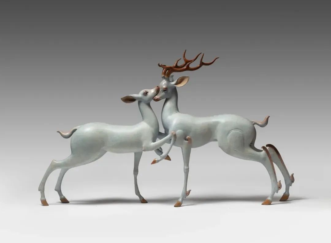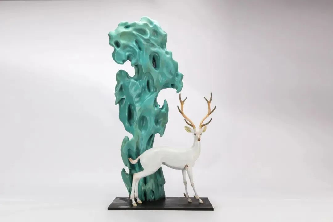 诗仙李白戴天山访友漫步时写下“树深时见鹿”,创造了东方美学的一幕经典情境。李白仙去一千年之后的贝多芬在另一个时空创作了《月光奏鸣曲》(即《月光曲》),爱情和自然的情愫交互着变,细腻心事随动人旋律娓娓道来。今人常将李白与贝多芬跨时空对照,亦曾有人翻译《静夜思》并配以《月光曲》在国际上传播,颇有高山流水、琴瑟和鸣之妙。王大朋以其当代东方美学系列代表作对话德国当代生活美学品牌 RUF,也有异曲同工的逸趣。日新月异的深圳湾上,同样是致敬经典气质的表达者与演绎者,王大朋以鹿为主的瑞兽作品与 RUF 的作品相互映照,各呈怡人柔睦之态。伴着月光曲,观者看展仿如游园,循着五重境,流连于似梦非梦的如歌行板中,体悟东西方美学不同向度的交汇与共鸣: