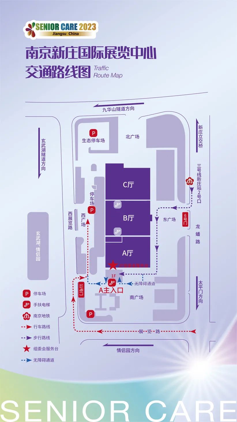 地铁:乘坐3号线地铁,在“南京林业大学·新庄”站下车,从2+ 号口出站,步行4分钟,从南京国际展览中心6号门进;