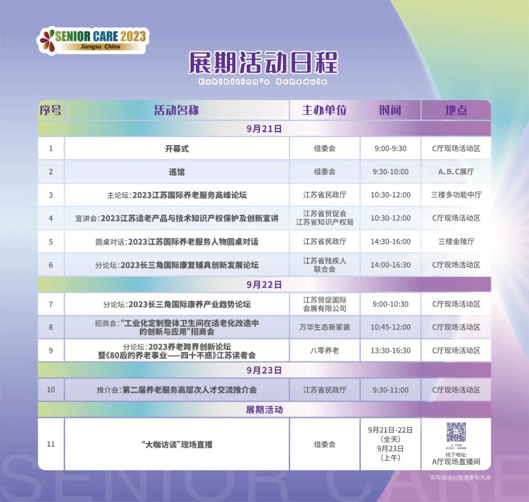 可扫描以下二维码,收看2023江苏国际养老服务博览会开幕式及多场精彩论坛。