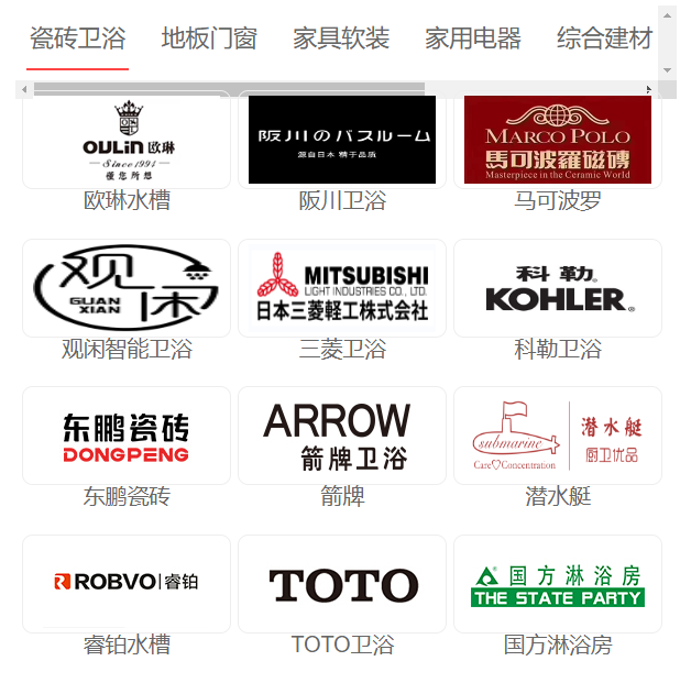 1、瓷砖卫浴:睿铂水槽、·冠珠瓷砖·、德国MDQ、欧琳水槽、阪川卫浴、观闲智能卫浴、科勒卫浴、潜水艇