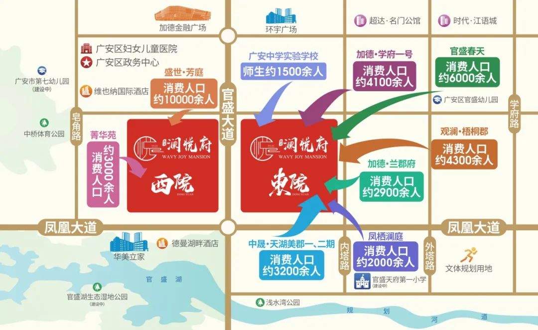 项目位于官盛新区核芯地段,无缝衔接广安中学实验学校、官盛天府第一小学(官盛小学),毗邻区妇女儿童医院、官盛湖湿地公园(建设中)、儿童游乐公园(规划中),辐射众多品质社区及企事业单位、行政机关。集结校园、社区、事业单位三大消费群体,汇聚20万人流,是整个城市人气旺盛、人群流动频繁的区域,夯实的人气基础,带来庞大消费力。