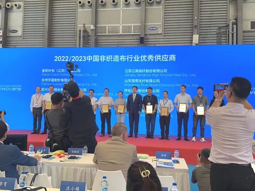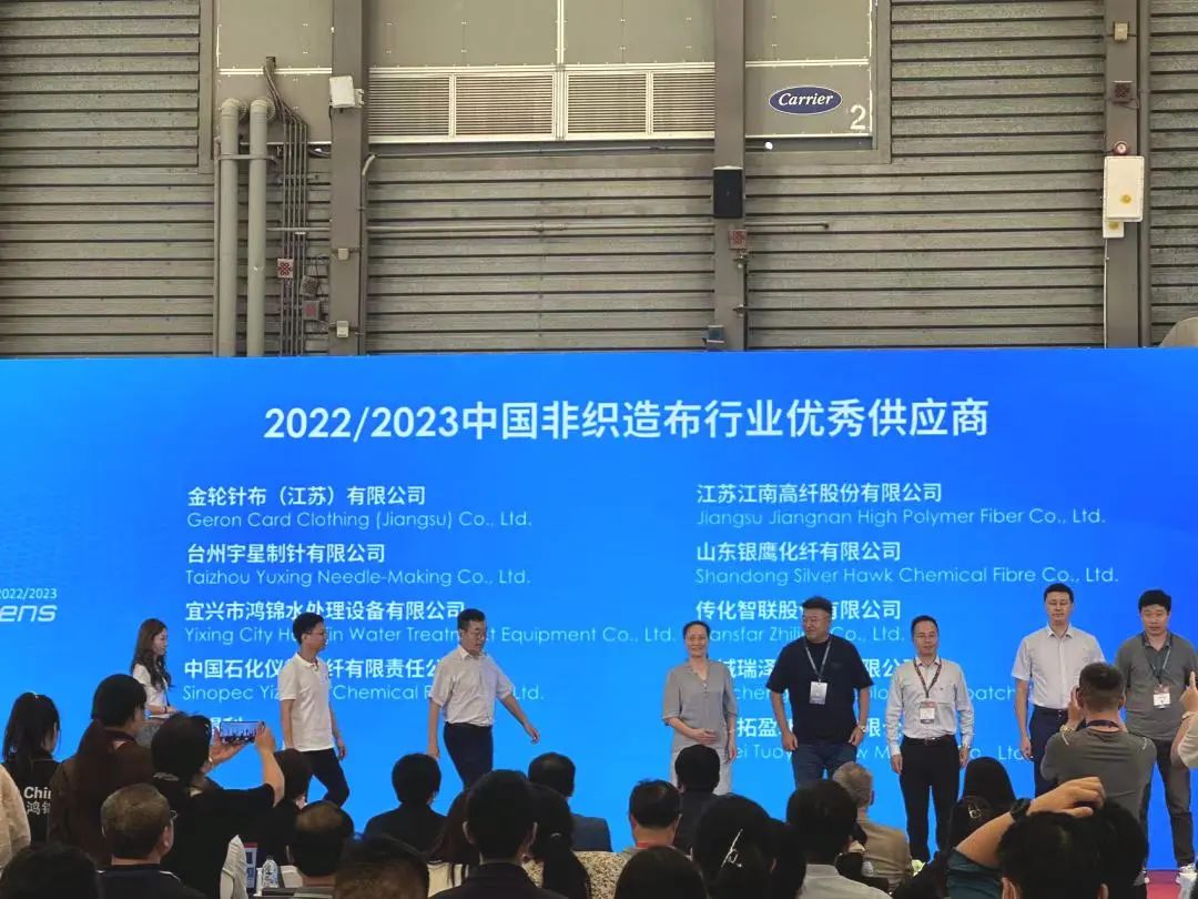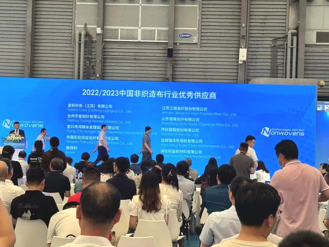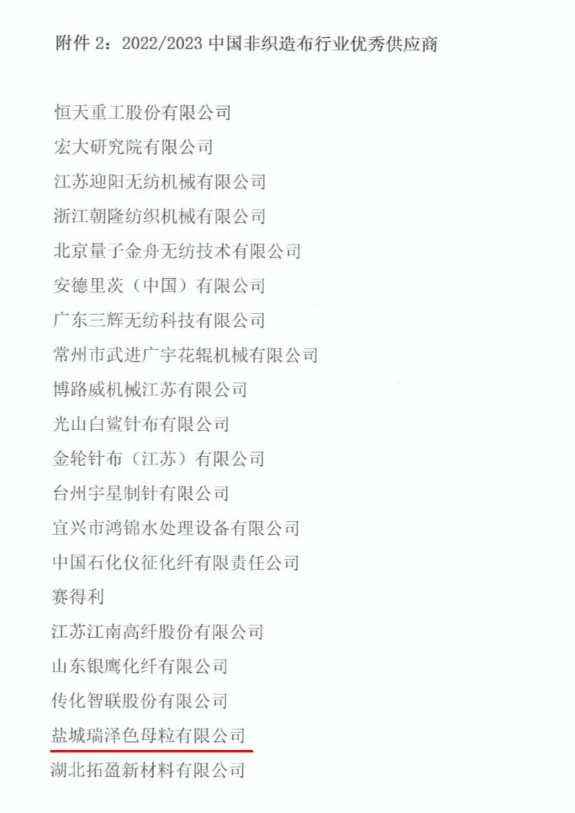 在第十六届中国国际产业用纺织品及非织造布展览会(CINTE23)展会现场,召开“2022/2023中国非织造布行业优秀供应商”入选企业颁奖典礼,盐城瑞泽色母粒有限公司获此殊荣,喜获“2022/2023中国非织造布行业优秀供应商”称号!