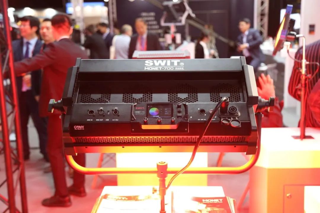 SWIT首次在欧洲展示了全新MONET系列大功率柔光平板灯,拥有1:1 400W和2:1 700W两个版本,具备IP54防护等级,适用于全天候的户外使用,内置Lumenradio接收模块,并具备配件快速替换等设计。