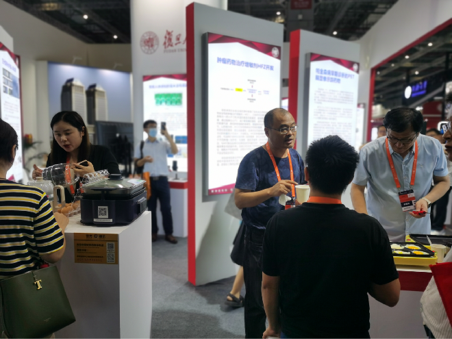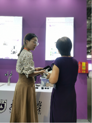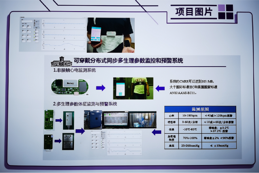 此次张丽敏教授团队携“可穿戴分布式同步多生理参数监控与预警技术”参展,此监测系统是通过无线组网技术同步采集人体体温数据、PPG信号和非接触心电信号,进一步计算脉率、血氧饱和度、体温、呼吸曲线、心电、血压等生理参数,进而存储显示并作出预警,具有穿戴方便、多生理参数同步分析的显著优势。