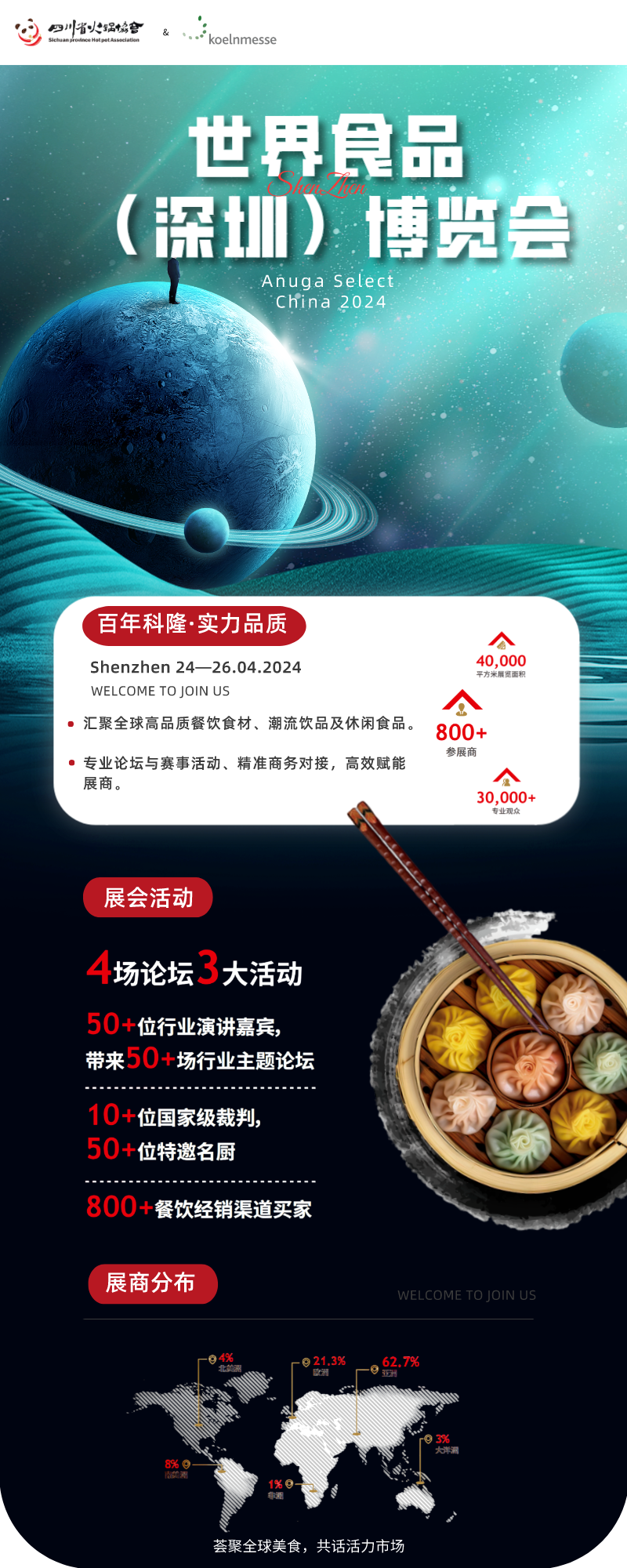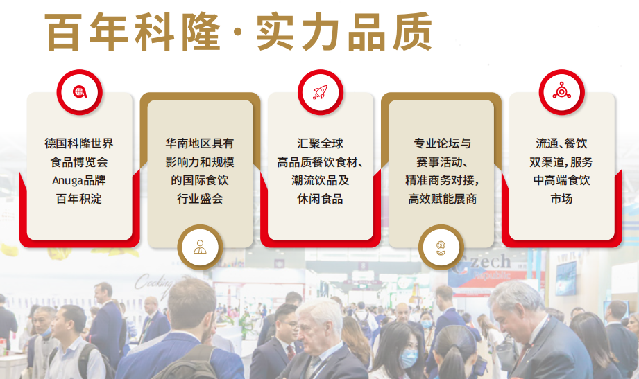 2024年,世界食品(深圳)博览会将在Anuga的全球战略指导下升级品牌--Anuga Select China将正式落地中国大湾区。Anuga科隆世界食品博览会创立于1919年,已经成为全球领先的国际食品展,获得了近12,000家全球食品与饮料领域优质供应商的青睐,以及全球110多个国家的认可和超过35万全球买家的高度评价。