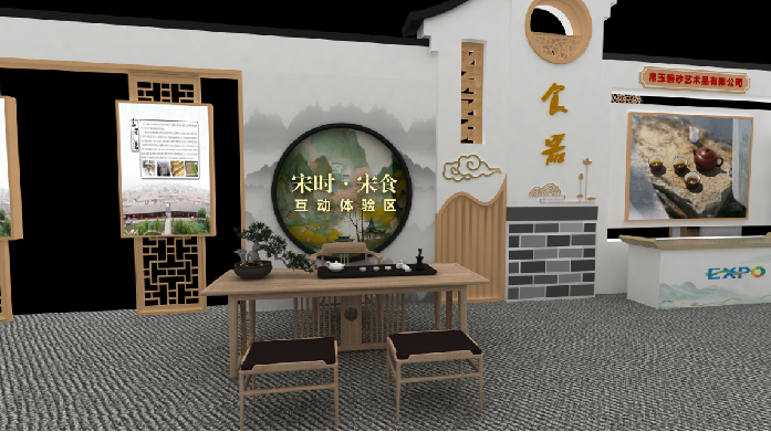 1、运河美食文化展馆中的“美食·文化”展区,打造“宋时·宋食”互动体验区,身着宋式汉服的茶艺人员现场表演,观众可进行品茶、点茶等茶艺互动。