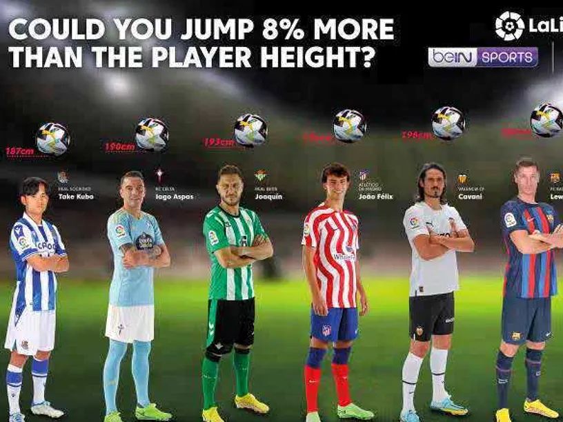 西班牙甲级联赛在现场设计互动环节中,你可以亲身体验足球运动员在比赛中的头球高度。