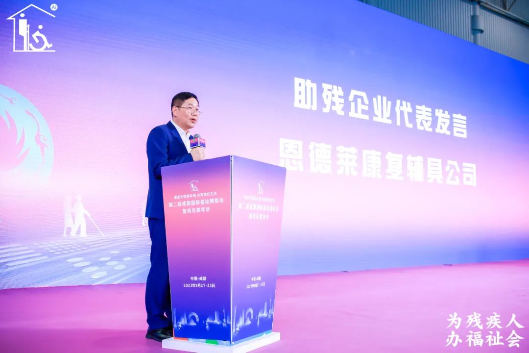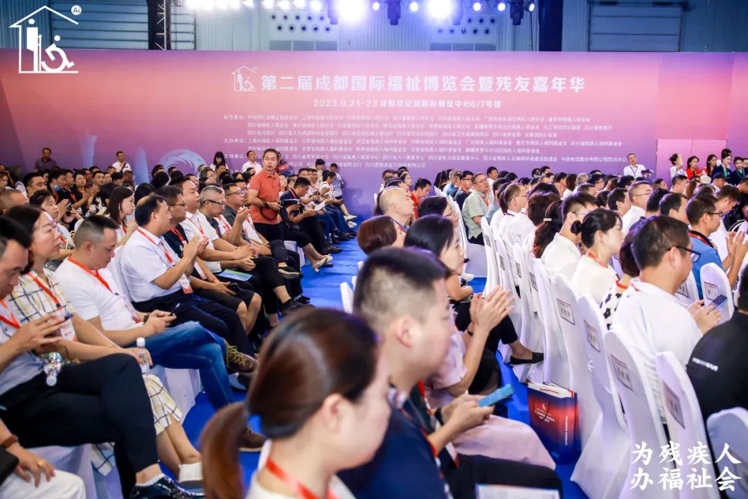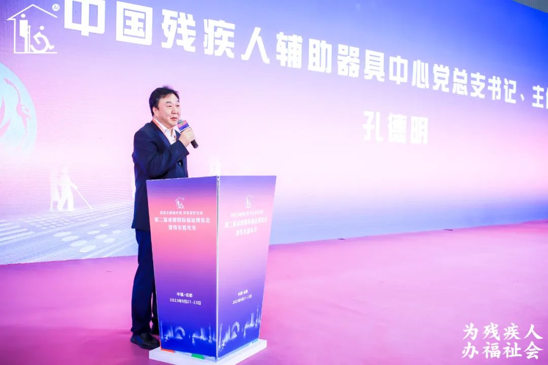 中国残疾人辅助器具中心党总支书记孔德明在讲话中表示:举办“营造无障碍环境·共享美好生活——第二届成都国际福祉博览会暨残友嘉年华”,是在中国残联第八次全国代表大会胜利召开之际举办的一次大活动。是面向社会充分展示新时代我国东、中、西部残疾人事业的一次大宣传。是贯彻落实《中华人民共和国无障碍环境建设法》,为残疾人营造无障碍生活环境及人文关怀的一次大推动。是残疾人及其亲友了解、体验在无障碍环境下享有康复、教育、就业、文化体育、生活等的一次大服务,是广大残疾朋友一个的节日。是残疾人工作者现场学习无障碍服务业务,更好为促进残疾人事业高质量发展的一次大培训。是充分展示东、中、西部残疾人事业发展,为推进各地无障碍环境建设,促进各地对接引进专业助残机构、专业企业,更好服务残疾人的一个大平台。是各地各级残联、助残机构以及相关专家、学者研究残疾人事业发展的一次大调研。是引导社会公众进一步了解 “营造无障碍环境”体现无障碍人文关怀的一次大科普。让更多人了解“无障碍”,不仅有出行无障碍,还有康复无障碍、教育无障碍、就业无障碍、文化体育无障碍、生活无障碍的全维度无障碍环境理念。