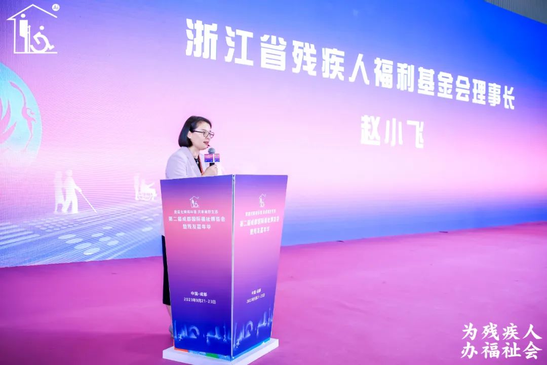 浙江省残疾人福利基金会理事长赵小飞作为联合主办单位致辞,她致辞中提到:浙江是全国首个共同富裕示范区,近年来,浙江四川进一步深化东西部协作和交流合作,区域残疾人事业发展合作成效成效显著,浙川东西部助残协作得到国家乡村振兴局和中国残联高度肯定,众多浙川残疾人事业合作项目广受赞誉。举办成都国际福祉博览会暨残友嘉年华就是贯彻落实国家东西部协调发展和成渝地区双城经济圈战略部署的一次具体举措;是东、中、西部残疾人组织共同推进建设无障碍环境的一次大协作。她认为:全国各地各级残疾人组织全心全意为残疾人谋福祉、解难题、办实事,在促进残疾人全方位无障碍方面做了大量工作。这次福祉博览会活动既有围绕党和国家中心大局的高度,又有深入服务残疾人无障碍需求的深度,还有关心关爱各类残疾人群体的温度,更有跨区域联合全国12省(自治区、直辖市)残疾人福利基金会共同主办的力度,是一次有高度、有深度、有温度、有力度的大举措,大活动,大行动。