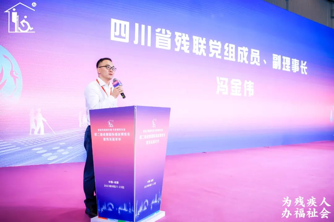 四川省残联党组成员、副理事长冯金伟在致辞中指出:本届活博览会是落实新时代“党委领导、政府负责、社会参与、残疾人组织充分发挥作用”的残疾人事业领导体制和工作机制,促进“国家扶持、市场推动、公办民办并举”的残疾人事业发展格局进一步形成的具体举措,是促进无障碍环境建设、辅具器具产业、残疾人事业发展的有力举措,是贯彻落实9月实施的《中华人民共和国无障碍环境建设法》的具体行动。无障碍环境,是社会文明的一扇窗口和重要体现,残疾人的起居生活、康复教育、就业及文化娱乐,都需要无障碍环境的保障。本届博览会将突出区域协同、助残服务、科技特色,重点体现残疾人共享美好幸福生活的“大福祉”理念。四川省将会同兄弟省市区残联,搭建政府指导、公益搭台、爱心企业参与、残疾人共享的无障碍综合展示服务的大平台,共同推动无障碍环境建设,为残疾人提供全方位无障碍服务场景体验,进一步汇聚全社会力量推动残疾人事业高质量全面发展。