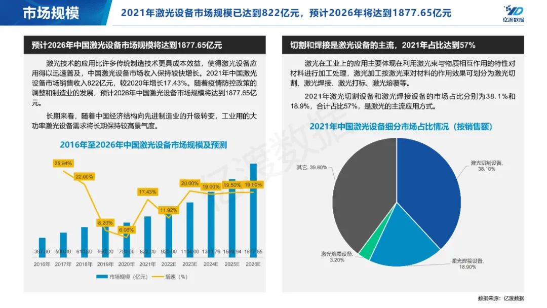 激光设备是实现激光加工的工具,具有输出能量集中、稳定的特点,能够较好地处理传统工艺方法较难处理的硬度大、熔点高的材料。2021年中国激光设备市场销售收入822亿元,较2020年增长17.43%。随着疫情防控政策的调整和制造业的发展,预计2026年中国激光设备市场规模将达到1877.65亿元。